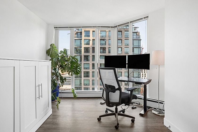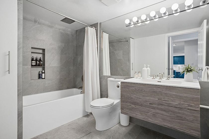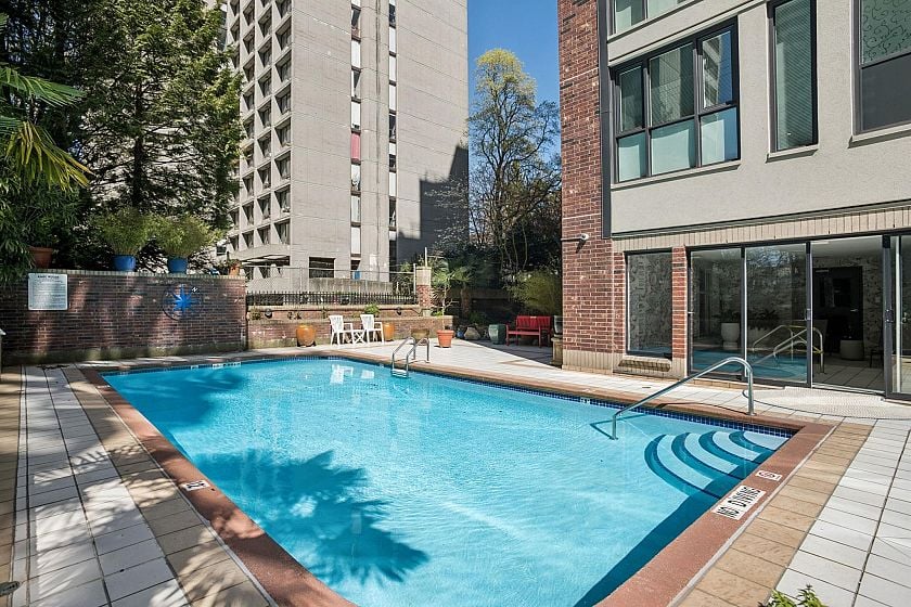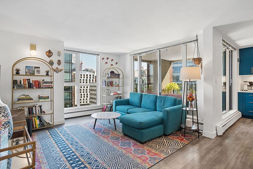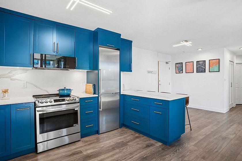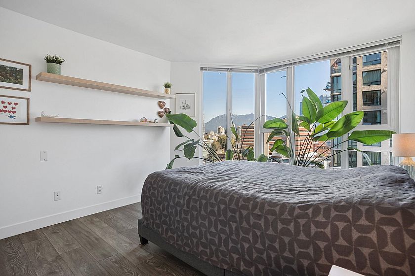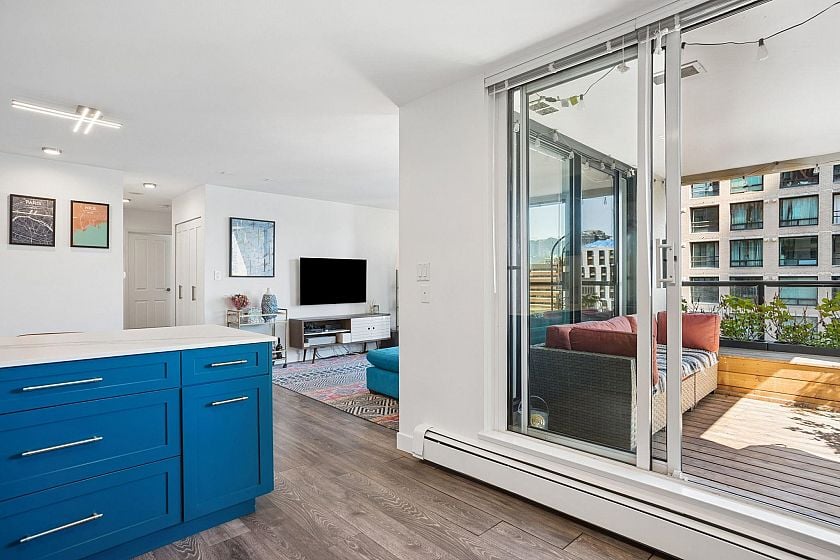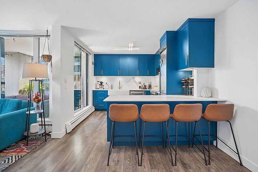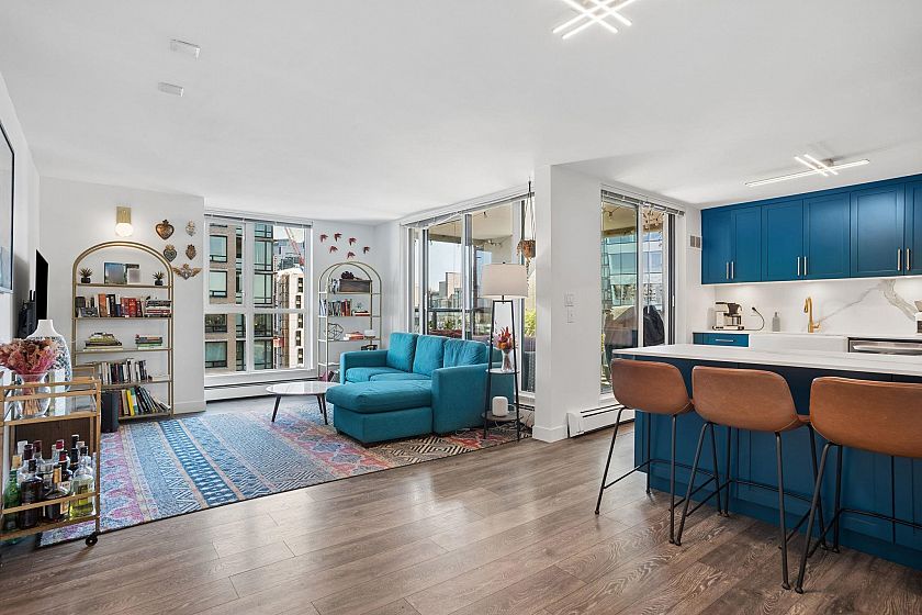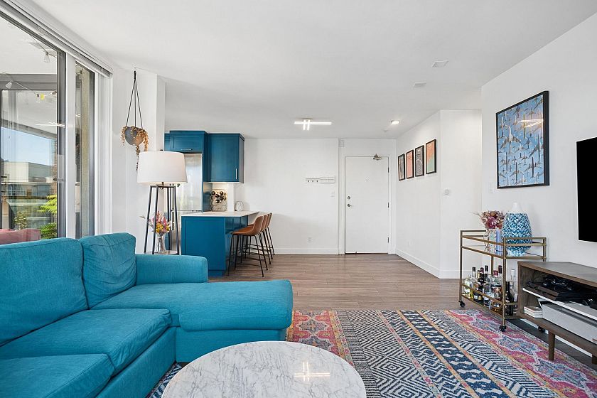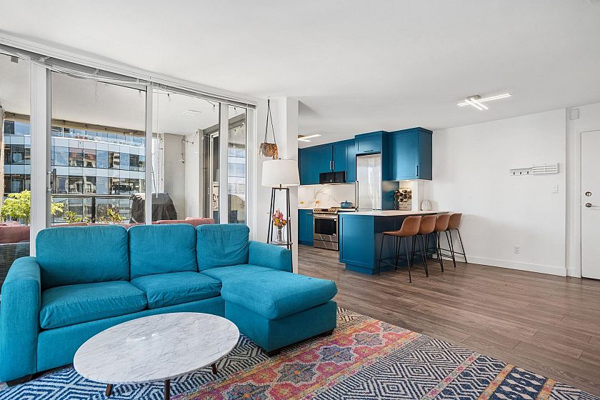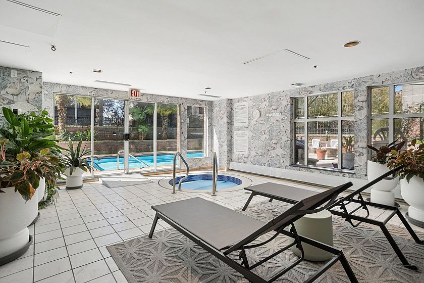 Beautifully renovated large 2-bed, 2-bath upper corner unit in the West End’s coveted building, The Ellington. Spanning just under 1,000 sq ft, this home offers a seamless balance of space, function & modern comfort. New flooring throughout, while large windows fill the home with natural light, set within one of the building’s most desirable floor plans. Fully reimagined kitchen features bespoke cabinetry, refined countertops, farmhouse-style sink & high-end appliances, offering ample storage & flowing seamlessly to a spacious patio—perfect for entertaining. Separate from the living space are 2 generous bedrooms with updated built-in storage, with the primary featuring city & mountain views & a spa-like ensuite. Fully rainscreened building with extensive amenities. A must see!