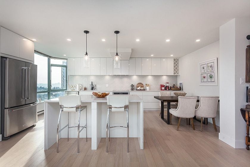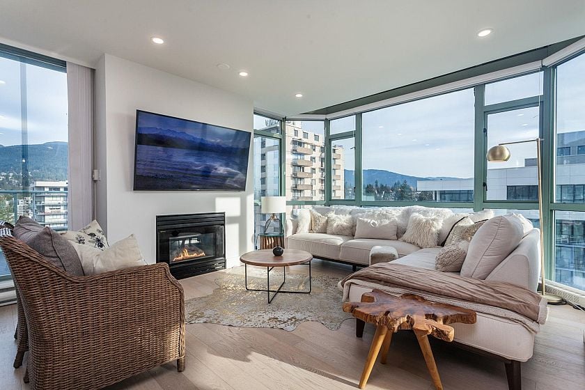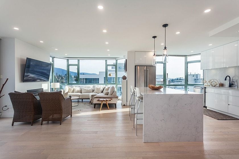 Fully renovated PENTHOUSE at Springhill Place with gorgeous mountain and water views from the kitchen. This suite has over 1,175 sf. of bright living space with floor to ceiling windows and beautiful White Oak Hardwood flooring. Kitchen is a chef’s dream offering plenty of custom cabinetry, large island, quartz countertops KitchenAid appliances, convection oven and induction cooktop. Oversized primary bedroom offers his/her closets and 5 piece ensuite bathroom. Tasteful matte black fixtures, LED mirrors, designer lighting, up to 9’ ceilings, 135sf balcony, and only 3 units per floor. 2 side by side parking spots and one oversized storage locker.