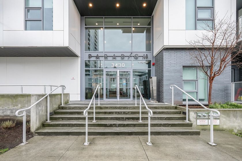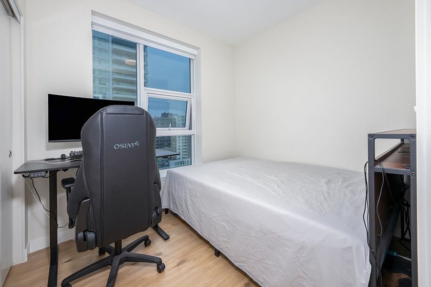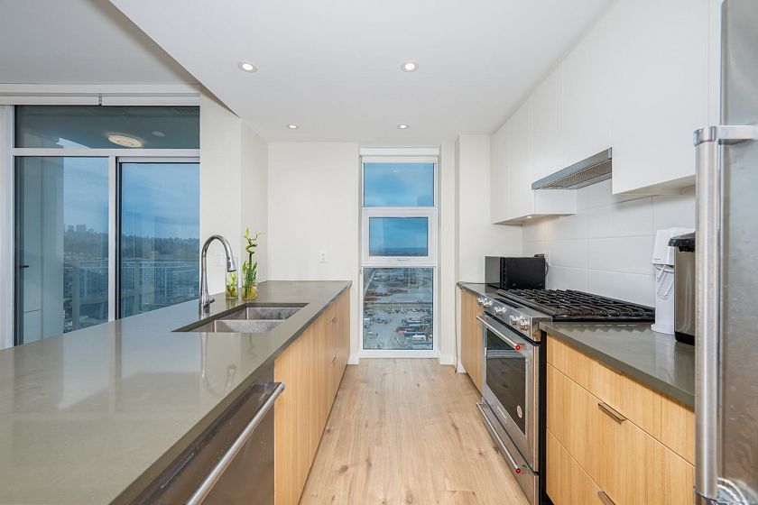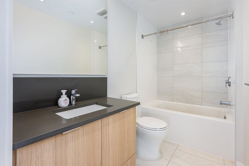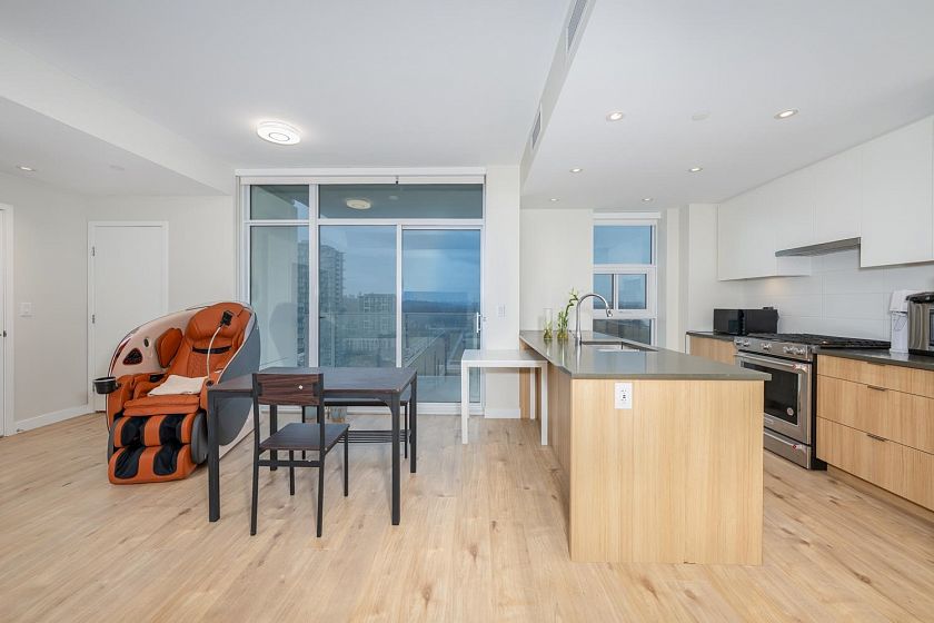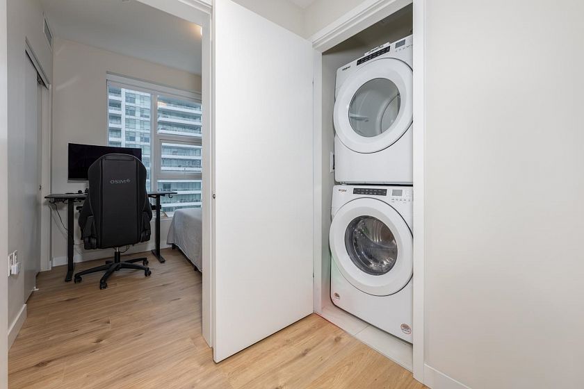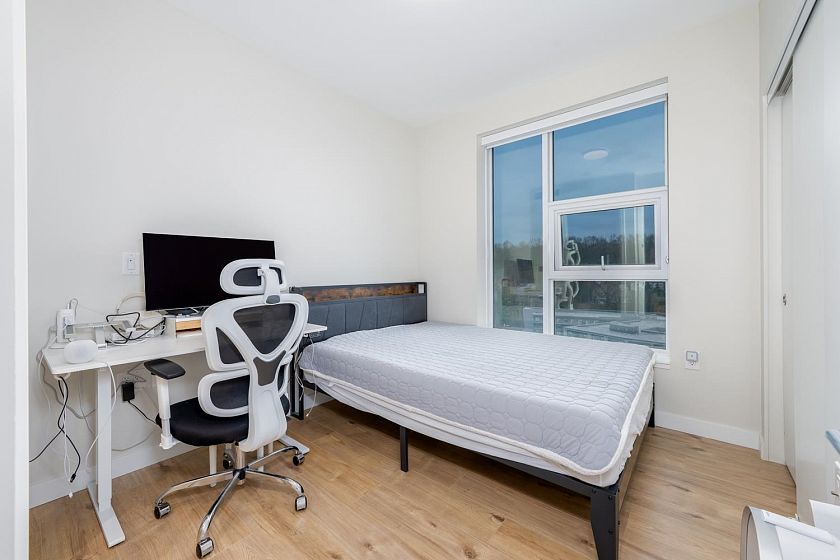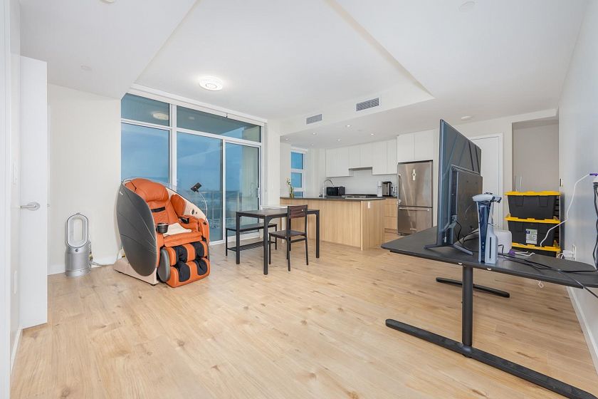 Welcome to this bright and beautifully maintained 2 bedrooms + 1 den Northeast facing unit offers an exceptional blend of natural light and serene surroundings—perfect for both homeowners and investors. The modern kitchen is equipped with quality appliances, sleek cabinetry, and ample counter space—perfect for cooking and hosting. Enjoy fresh air year-round from your private balcony, the perfect spot for morning coffee or unwinding after a long day. This home also includes in-suite laundry, secure parking, and access to concierge, fitness, yoga, rooftop BBQ and a party lounge. Just steps from scenic walking and cycling trails, parks, and easy access to Richmond, Burnaby, and Downtown Vancouver.