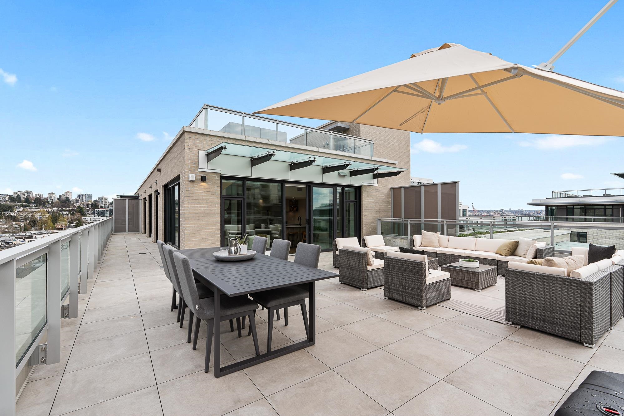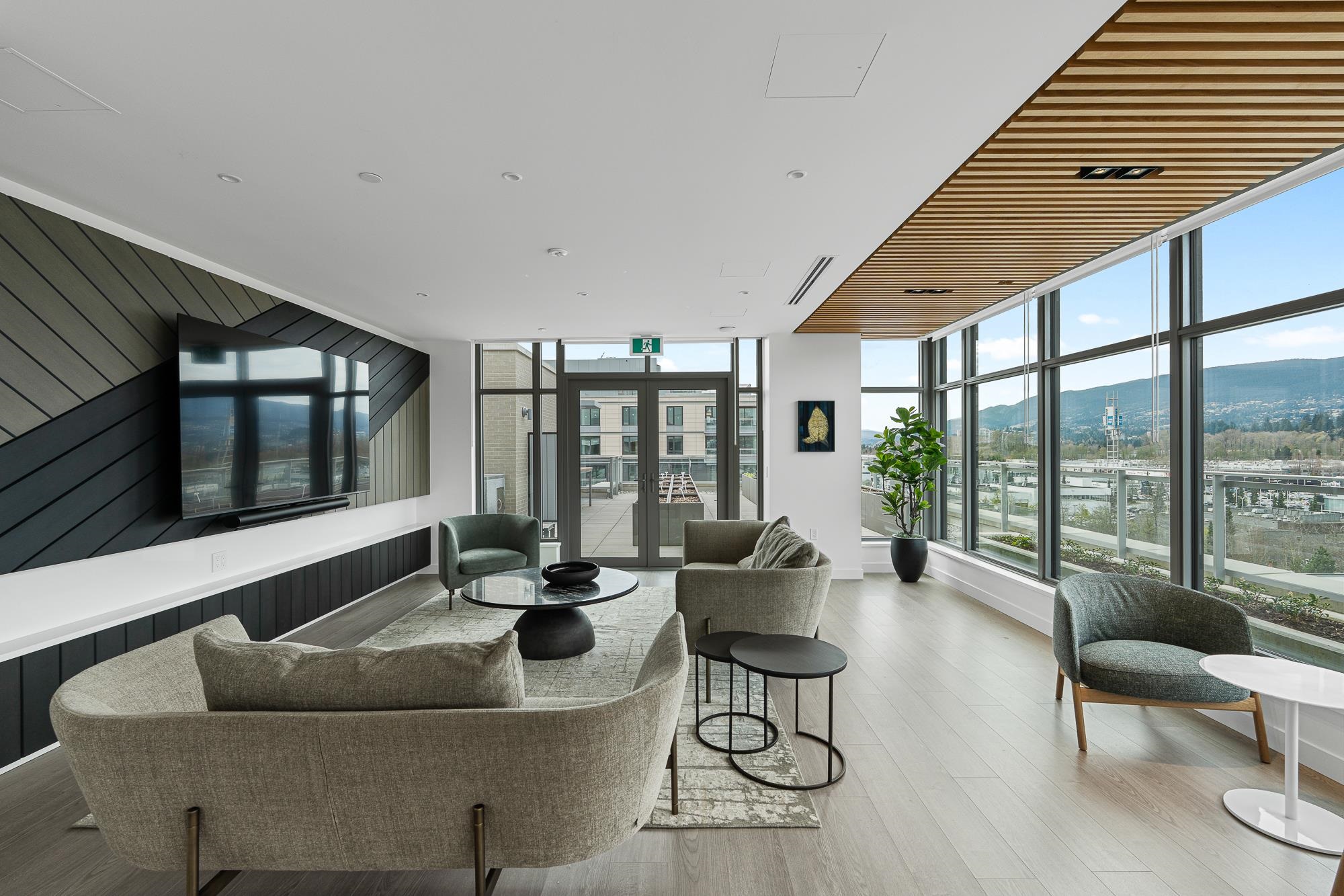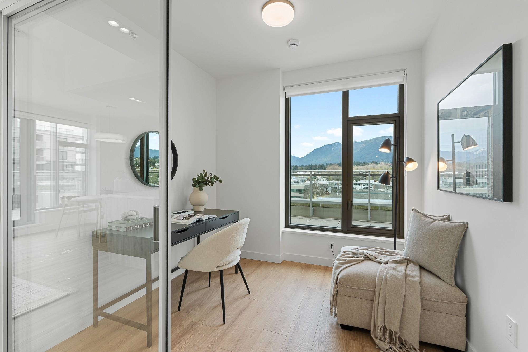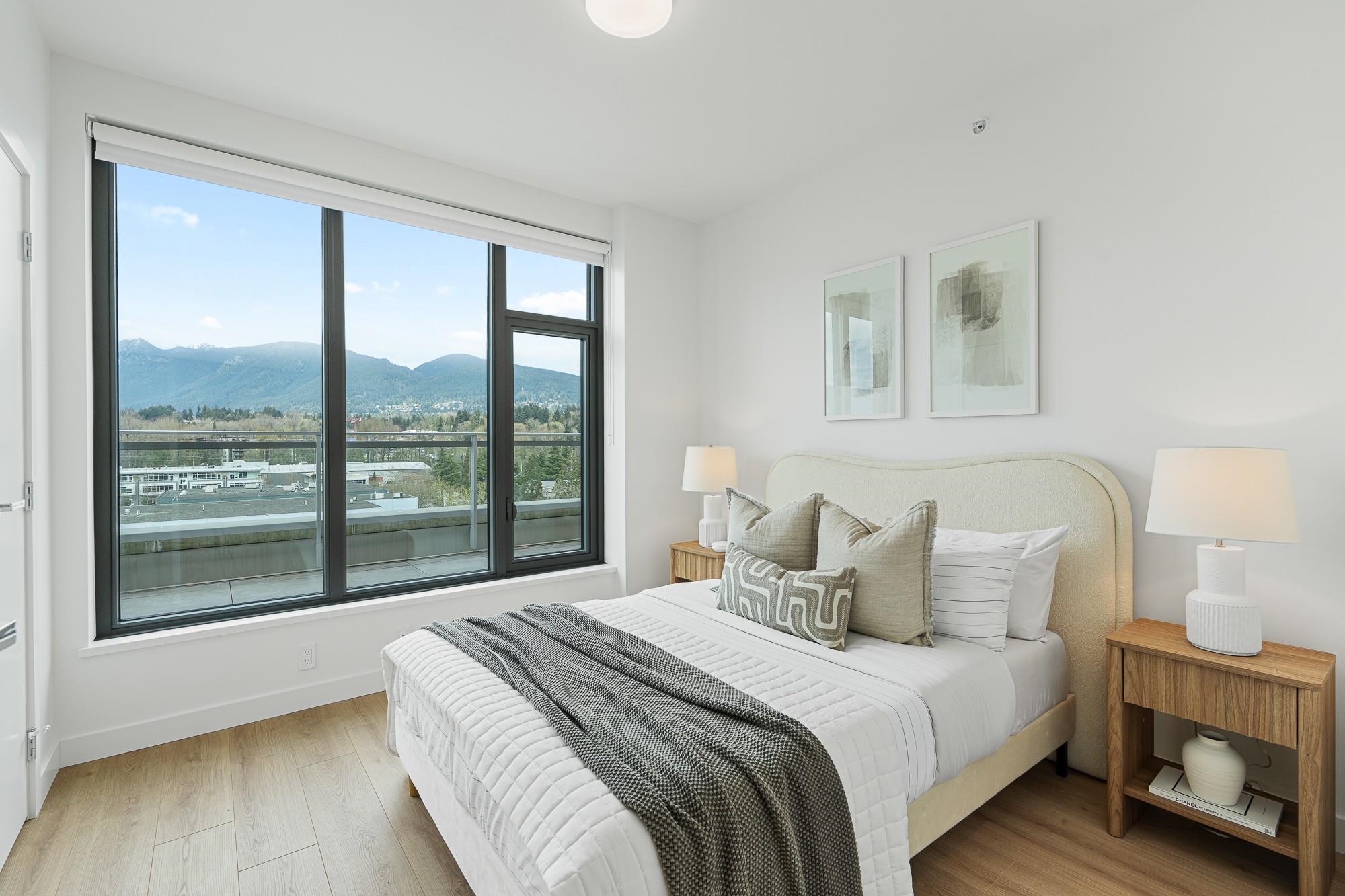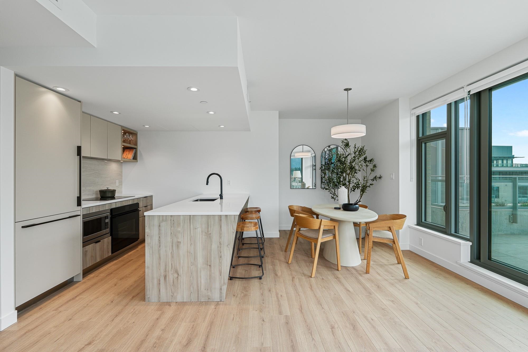 Wake up to the stunning & expansive views of the North Shore Mountains from this impeccable 2 BD & DEN at Harbourside. Coastal inspired design throughout blends the views with truly luxurious living. Be welcomed into your living room with expansive windows, white oak flooring. Separated Dining and true chefs Kitchen with gorgeous caesarstone counters, woodgrain integrated appliances and cabinetry throughout accented by elegant Riobel fixtures. Spacious bedrooms with gorgeous windows looking out to nothing but views w/FULL PRIVACY. PATIO of almost 1000sqft and even has a water view, it is truly one-of-a-kind! Building offers Conceirge, Gym and FULL event and party room on the 8th floor, complete with 2 kitchens, study lounge, patios, BBQs and gardens. EV Ready Parking & Storage locker incl.