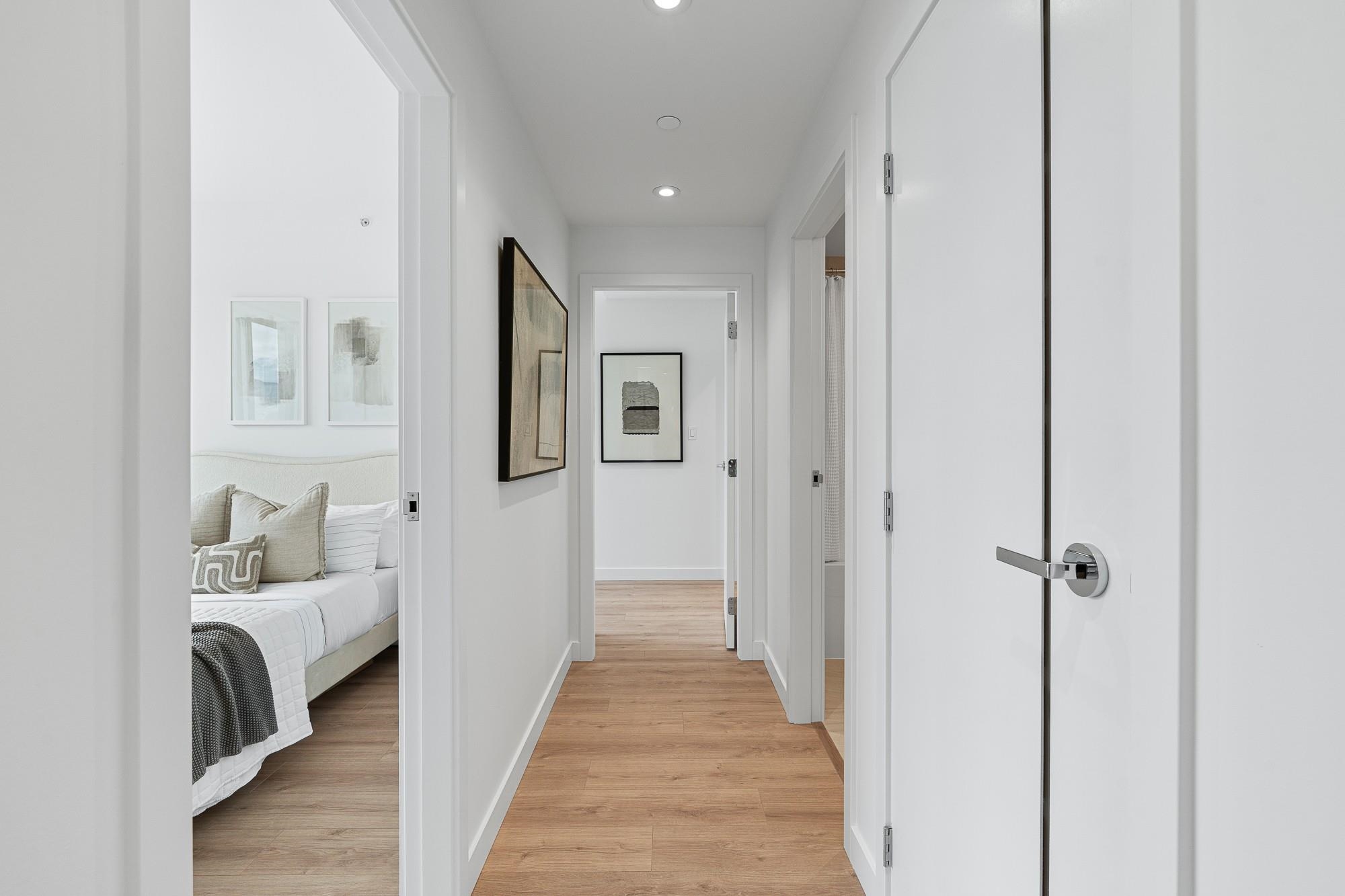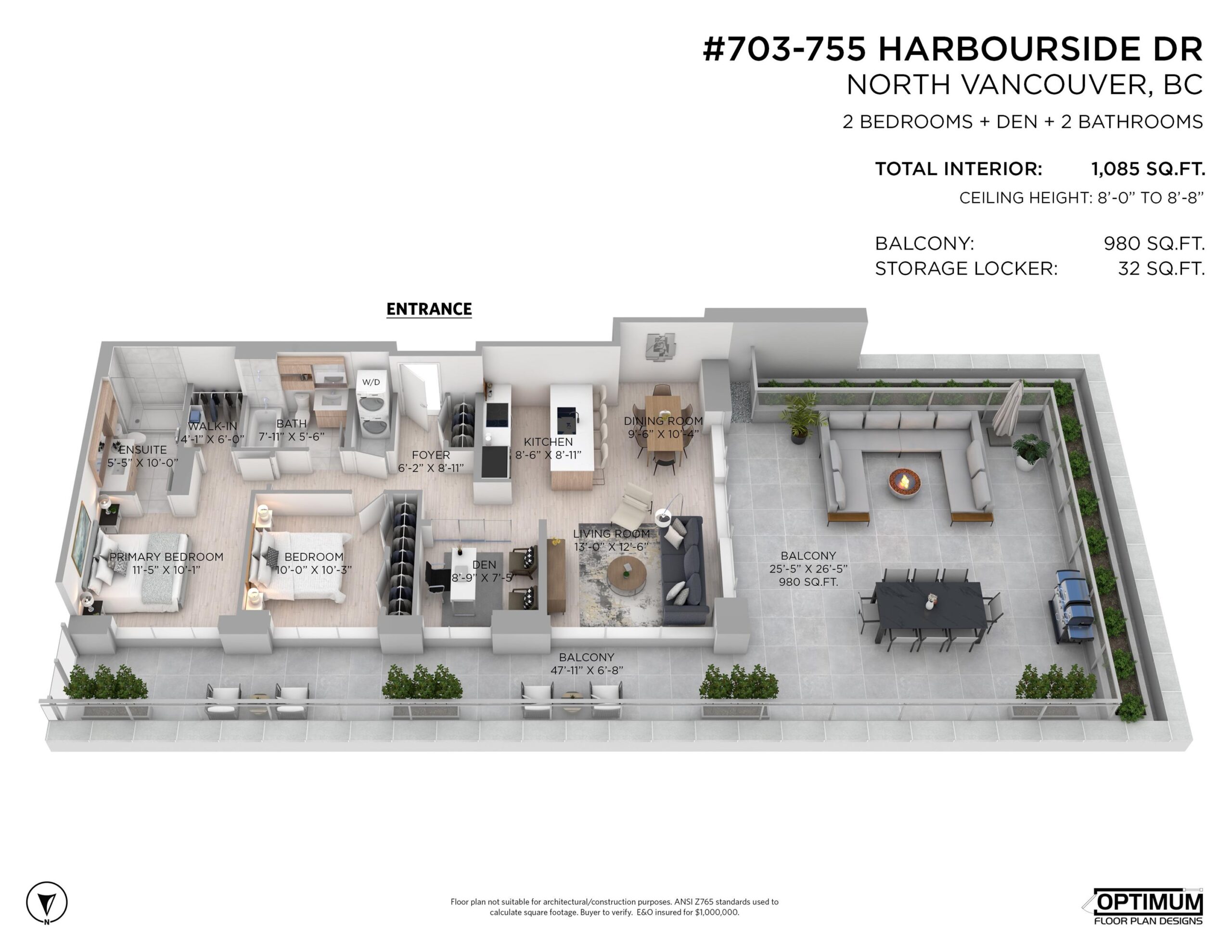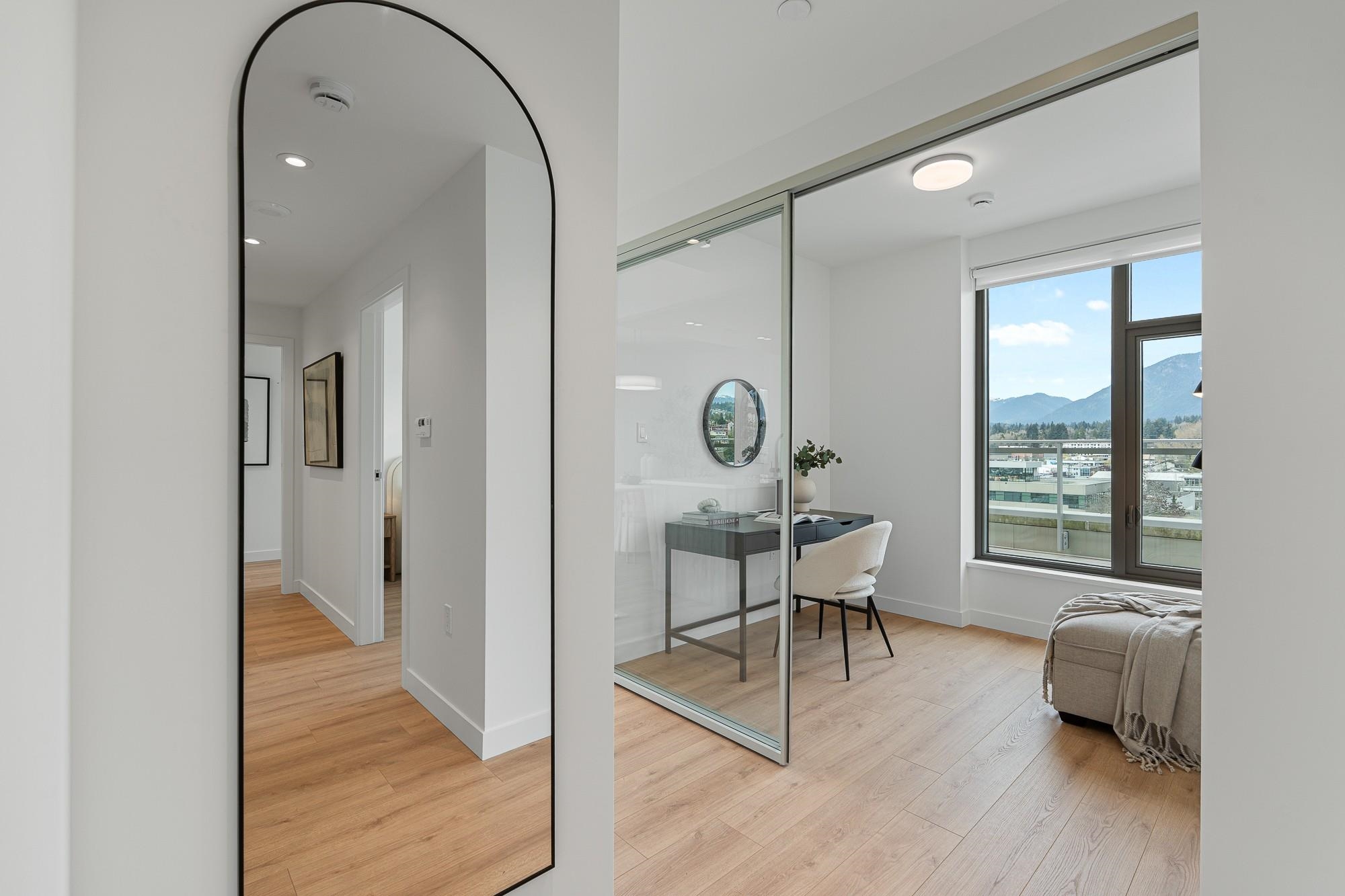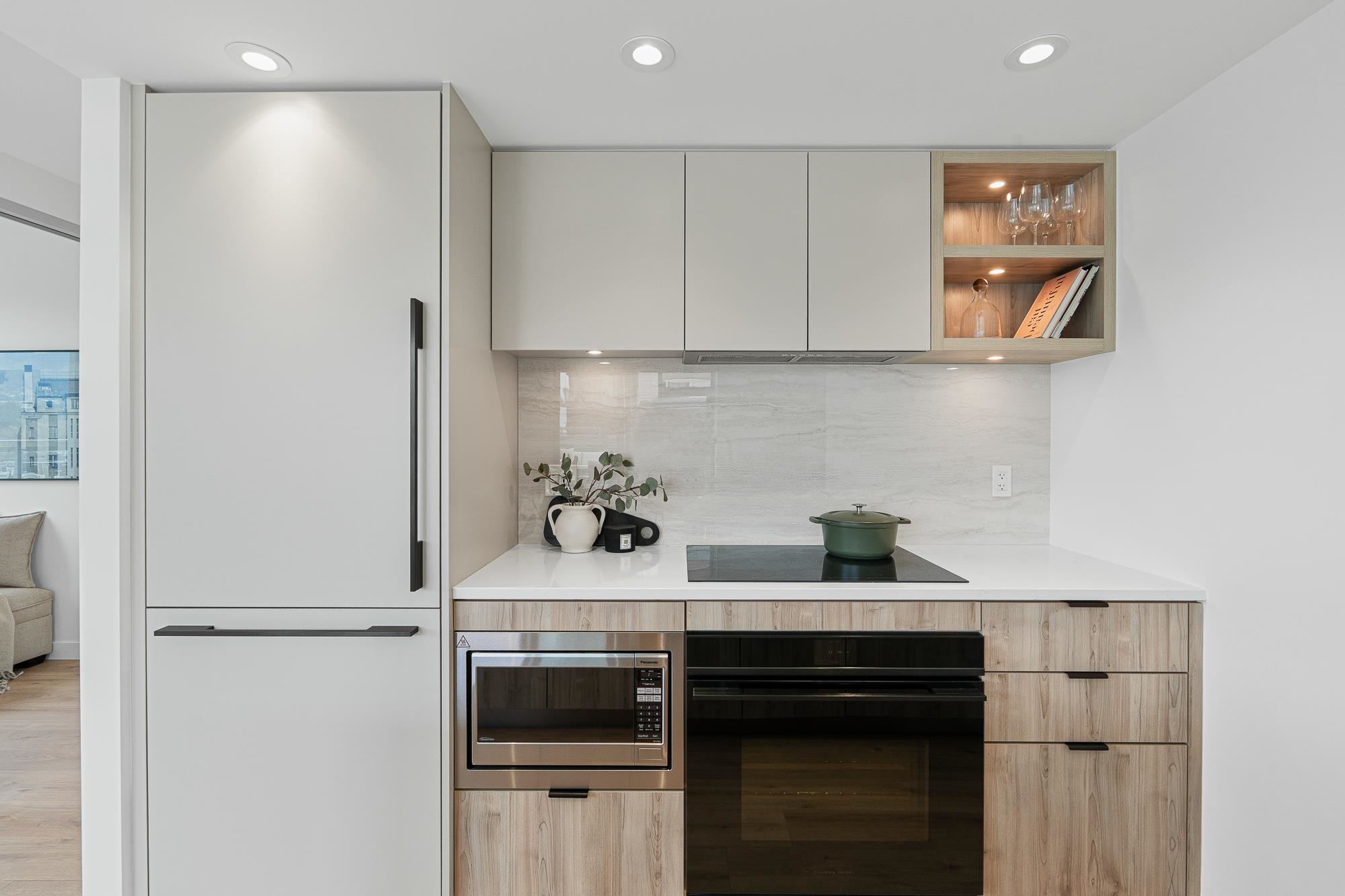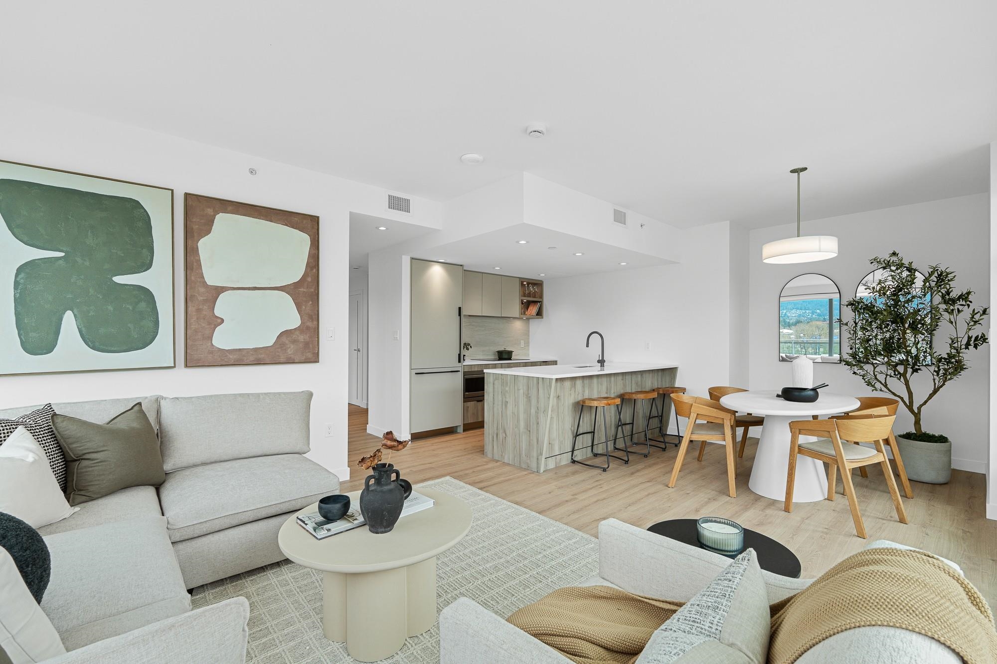 Wake up to the stunning & expansive views of the North Shore Mountains from this impeccable 2 BD & DEN at Harbourside. Coastal inspired design throughout blends the views with truly luxurious living. Be welcomed into your living room with expansive windows, white oak flooring. Separated Dining and true chefs Kitchen with gorgeous caesarstone counters, woodgrain integrated appliances and cabinetry throughout accented by elegant Riobel fixtures. Spacious bedrooms with gorgeous windows looking out to nothing but views w/FULL PRIVACY. PATIO of almost 1000sqft and even has a water view, it is truly one-of-a-kind! Building offers Conceirge, Gym and FULL event and party room on the 8th floor, complete with 2 kitchens, study lounge, patios, BBQs and gardens. EV Ready Parking & Storage locker incl.