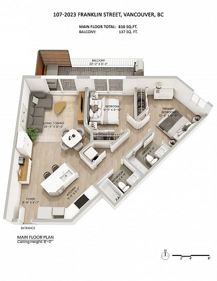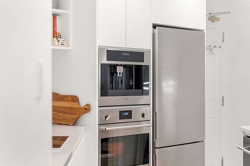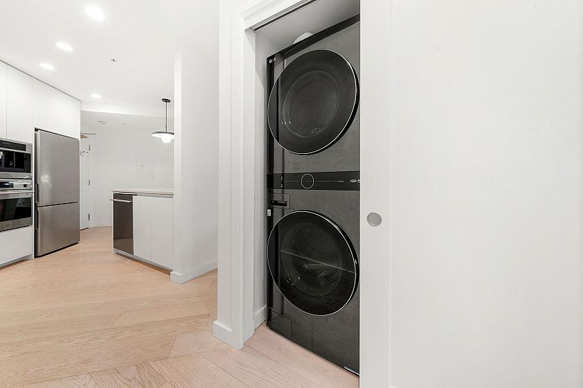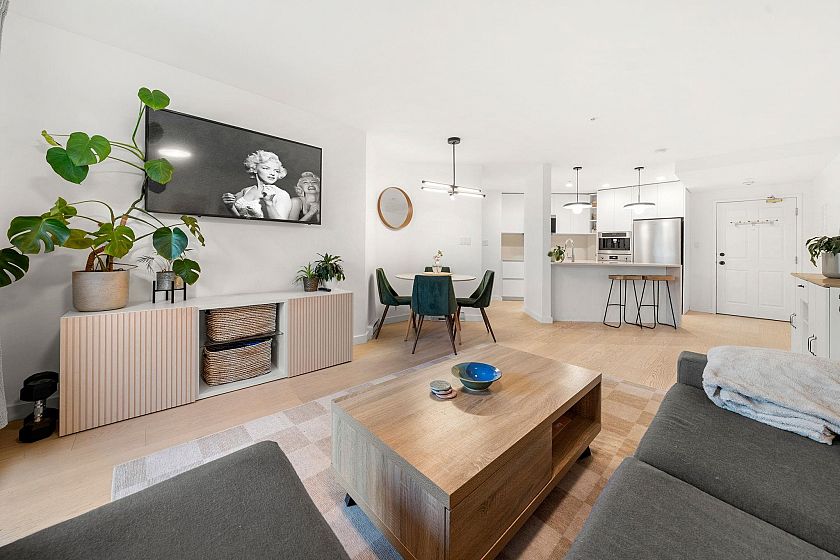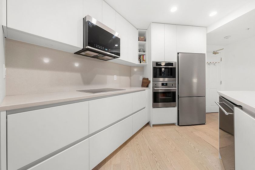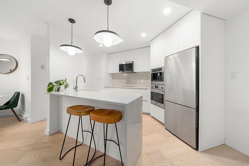 Completely renovated to the studs! Don’t miss this fully renovated 2-bed 2-bath home featuring white oak engineered hardwood, recessed lighting, and a stunning kitchen featuring integrated Fulgor appliances, Silestone counters, custom cabinetry, and designer pendants. New electrical panel, wiring, plumbing, drywall, doors, trim… everything has been done. Enjoy private townhome-style entry, two full spa-like bathrooms with radiant heated floors and artisan tilework, and in-suite laundry. Pet/rental friendly, 810 sq ft, with parking and storage. Steps to Pandora Park, Bosa Foods, cafés, breweries, and more. Book your private viewing today!