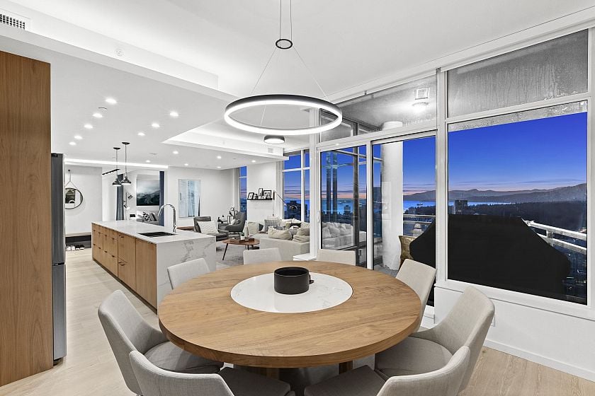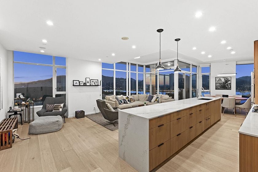 A serene masterpiece in Coal Harbour, this sub-penthouse spans the entire westerly half of the floor, offering rare scale, two private terraces, and unobstructed views of mountains, ocean, and city. Designed for refined living and effortless entertaining, the home balances expansive open spaces with intimate retreats. Bespoke finishes—including white oak flooring, matte black accents, frosted walnut millwork, and hand-applied Venetian plaster—create a calm, elegant backdrop throughout. Framing natural light at every turn, this residence is a sanctuary above the city, where thoughtful design meets enduring craftsmanship. A rare offering of quiet luxury in one of Vancouver’s most prestigious waterfront neighbourhoods.