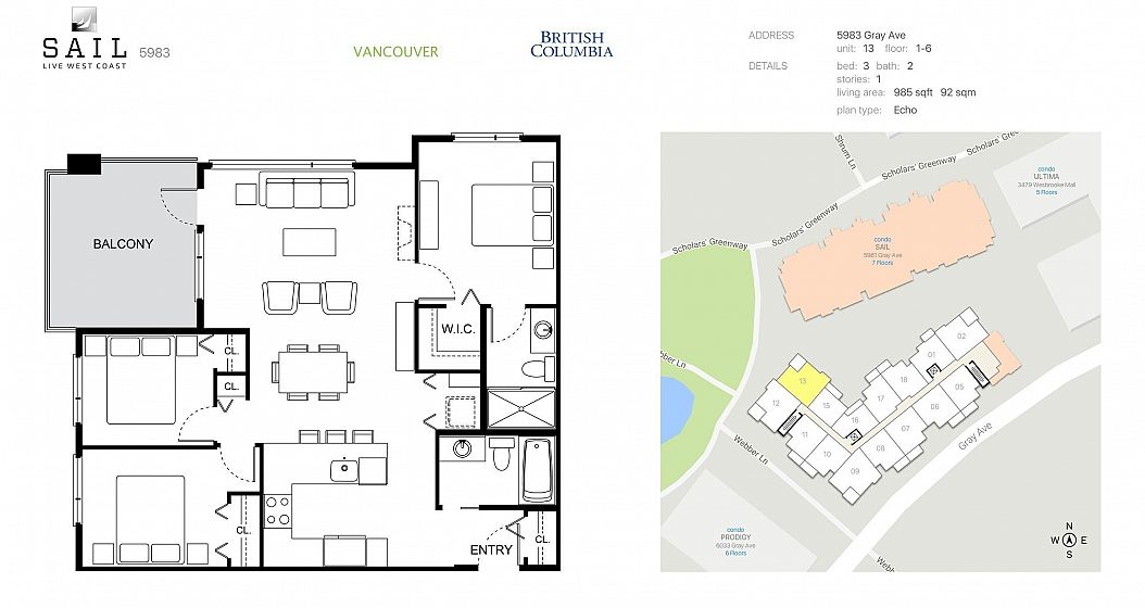 Located in the heart of Wesbrook Village at UBC, this rarely available 3-bedroom, 2-bathroom corner unit at SAIL by renowned developer Adera offers a perfect blend of luxury, comfort, and convenience. Surrounded by lush green space, fountains, and a tranquil courtyard, the home features a bright and functional layout with 996 SF of living space . Floor-to-ceiling windows and 9ft ceilings,In-floor radiant heating throughout,steps from the UBC campus, University Hill Secondary School, community centre, shops, restaurants, parks, groceries, medical clinics, and transit . Don't miss?