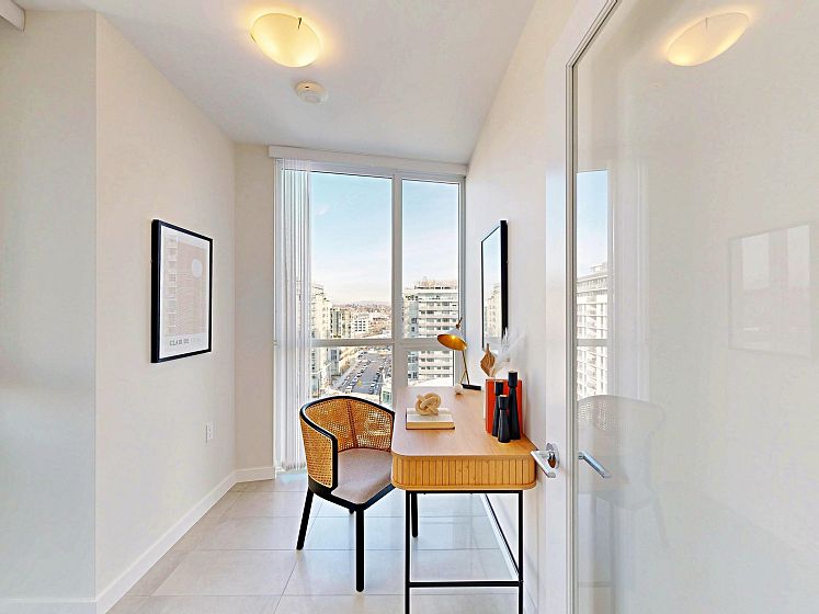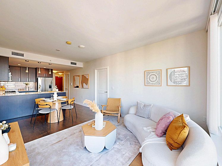 NE Corner home at Pinnacle on the Park with open views of the mountain, park and False Creek. Super efficient 1108 sq.ft. 3 bedroom + den with no wasted space. Perfect city home with full size chef's kitchen, enough rooms for home offices/guests, heat pump for heating & cooling comfort. Deluxe finishing, engineered hardwood floor, Bosch stainless steel appliances, gas cooktop. Building has gym, party room, courtyard, playground. Fantastic location in vibrant Olympic Village community, right by the sea wall, amenities, restaurants, shopping and transit. 1 parking and 1 storage locker. Staged suite, never been lived in, brand new. Easy to show.