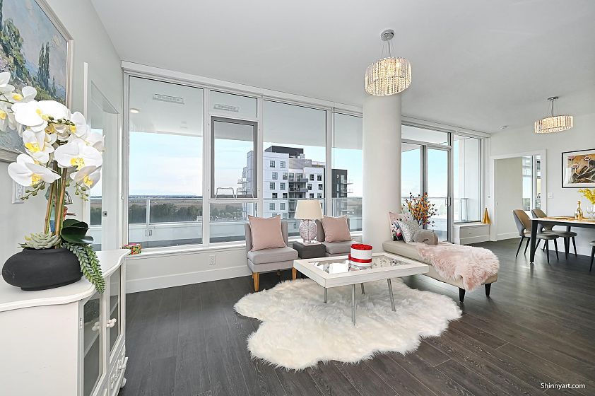MODE-Vancouver's last waterfront and tallest concrete highrise building in serene River District. This extra-large unit features SE corner 3 bed + 1 den, 2 bath with 1,100 sq.ft of living space, a 332 sq.ft south-facing balcony overlooking the Fraser River and Mt Baker. The functional layout with open-concept kitchen, dining and living areas allows natural light to flow through every corner, 3 bedroom separation for good privacy.Features 10-foot ceilings, hardwood flooring throughout,kitchen with high-end appliances,high efficiency heating and cooling system. Convenient location, steps from Save-on Foods, Shoppers Drug Mart, Liquor store, banks, bus, with green space along with gym, hot tub,media room, and business center. 2 parkings and 1 with EV, 1 Storage, 1 Bicycle Storage