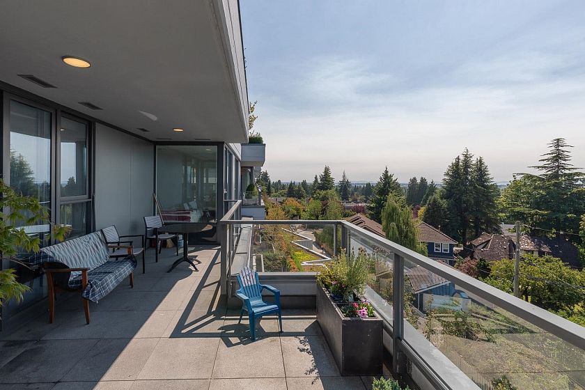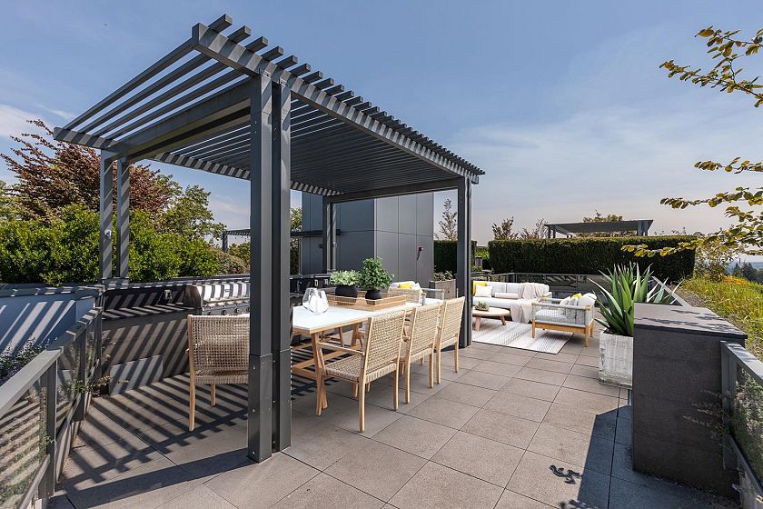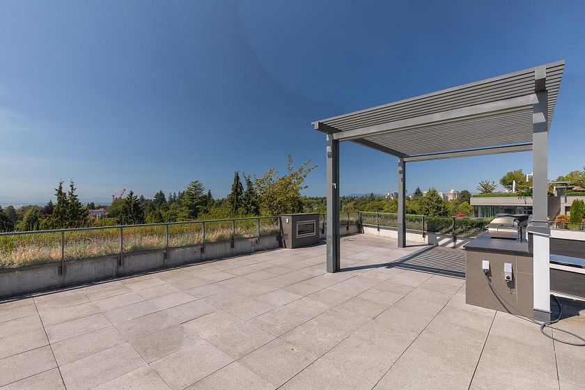 Northwest Penthouse in the Sterling by Cressey. Best unit in the building - This rare 3-bedroom, 3-bath penthouse offers 1870 sqft of luxurious one-level living with an unprecedented 1825 sqft of private outdoor space. 1293 sqft rooftop terrace with pergola, fireplace, and full outdoor kitchen, accessible by elevator. Enjoy unobstructed views all the way to Vancouver Island and seamless indoor-outdoor entertaining. The kitchen is a chef’s dream, paired with generous living and dining areas flooded with natural light. The home also includes a private 2-car garage with an additional 305 sqft storage room inside the garage – a truly rare feature. Perfectly positioned on the Arbutus Greenway with a grocery store below and steps to Kerrisdale and Arbutus Village, perfect downsizing opportunity.