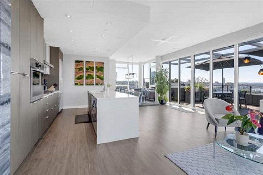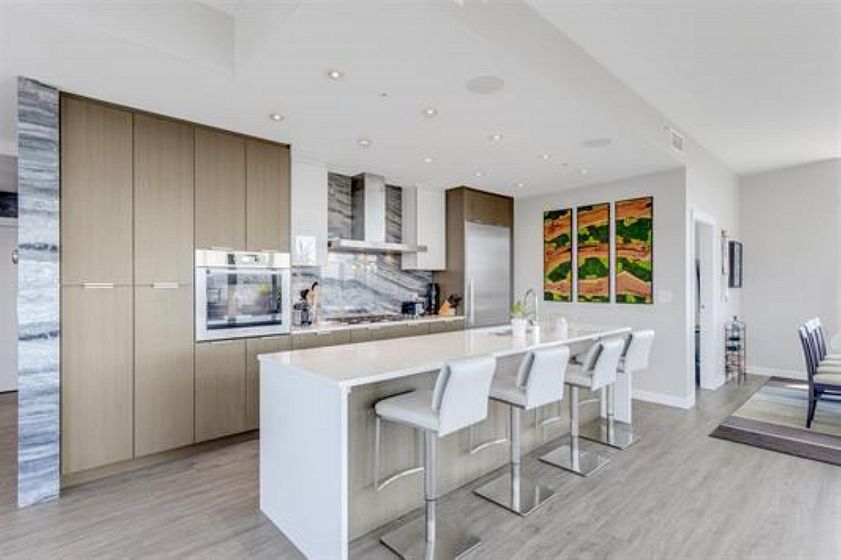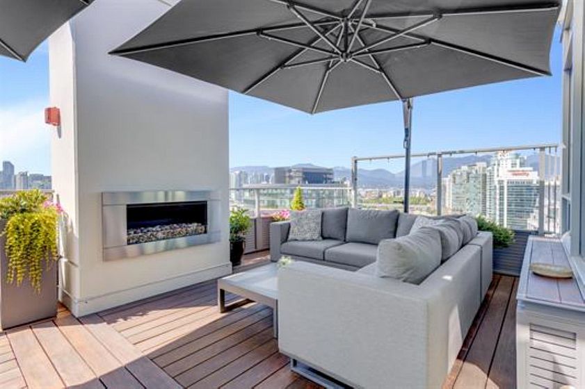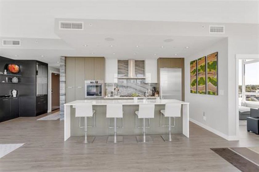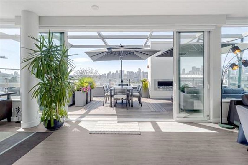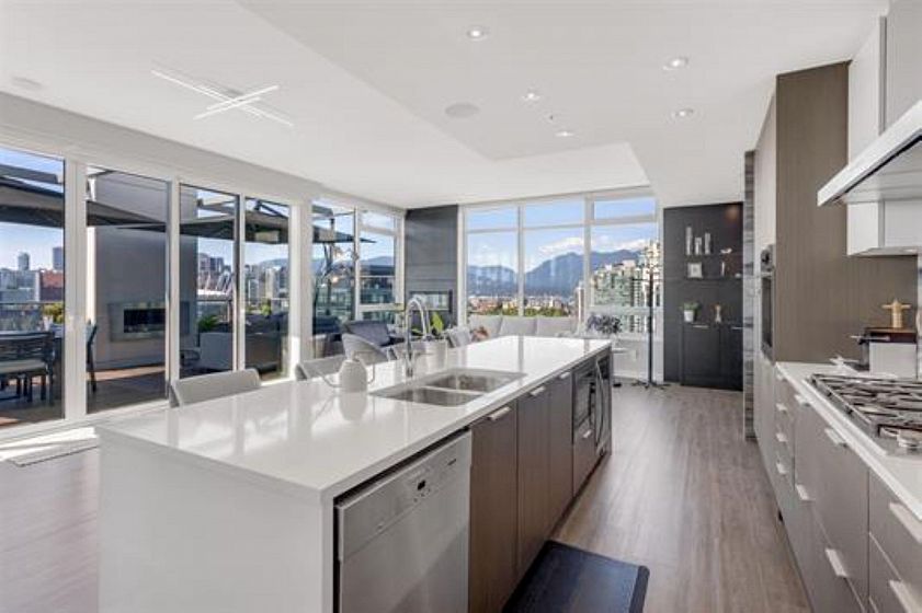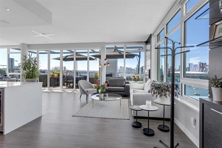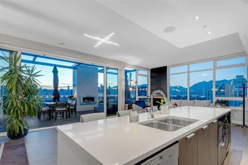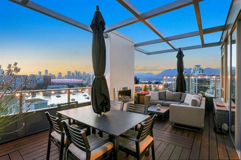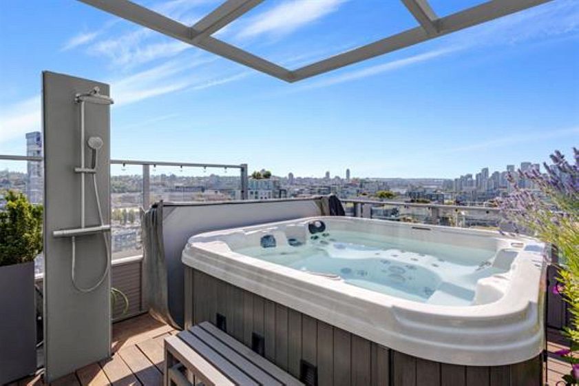 Soaring high above False Creek, the penthouse at Lido captures breathtaking panoramic views of BC Place, the downtown skyline, and the mountains beyond. Expansive decks finished with Brazilian hardwood create a private outdoor oasis with a 6x6 hot tub, gas fireplace, outdoor shower, BBQ hookup, custom lighting, and built-in storage, perfect for entertaining or unwinding under the stars. Inside, sophisticated automation integrates Lutron lighting, Sanos audio, Somfy blinds, and Nest-controlled HVAC. A chef's kitchen with Miele appliances, six-burner gas cooktop, and dual-zone wine cooler flows into an open-concept great room with custom millwork and an electric fireplace. Spa-inspired bathrooms offer heated Nuheat floors, Riebel fixtures, and a luxurious clawfoot tub. Three EV-ready parking