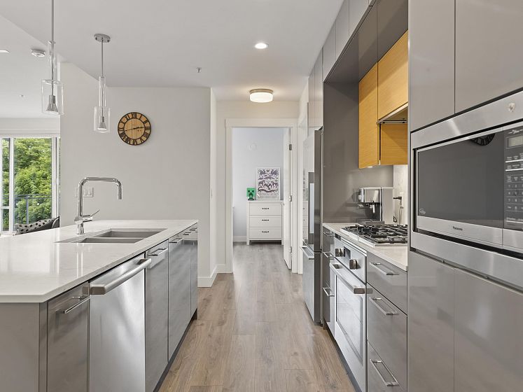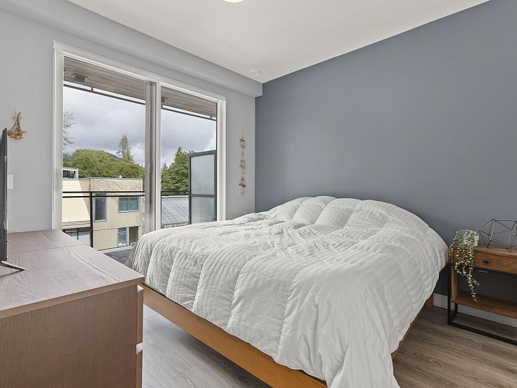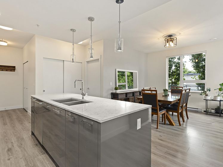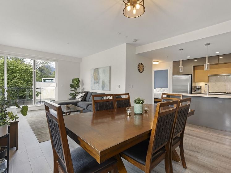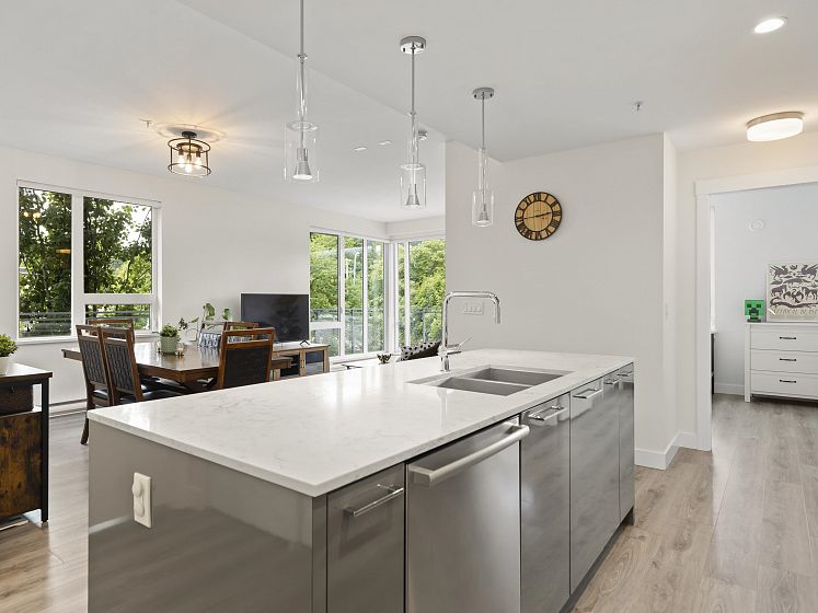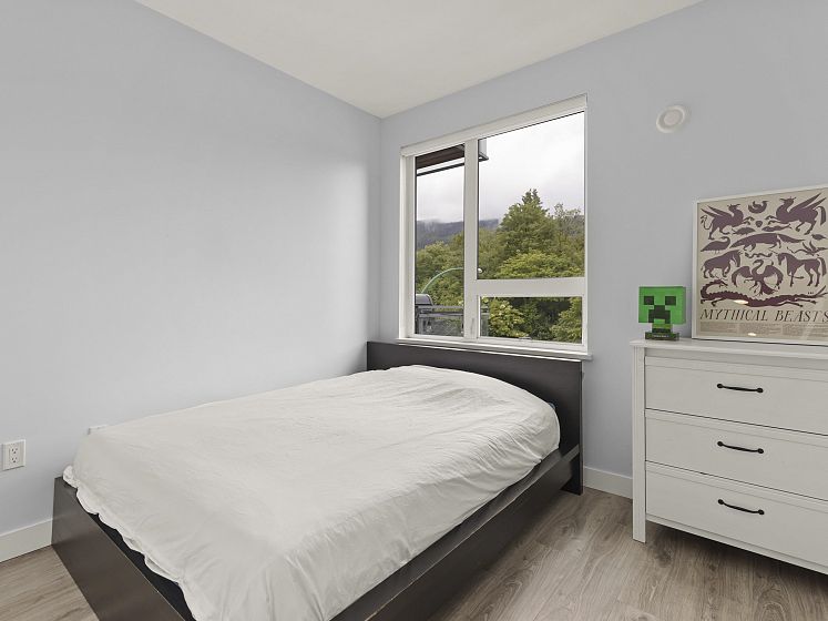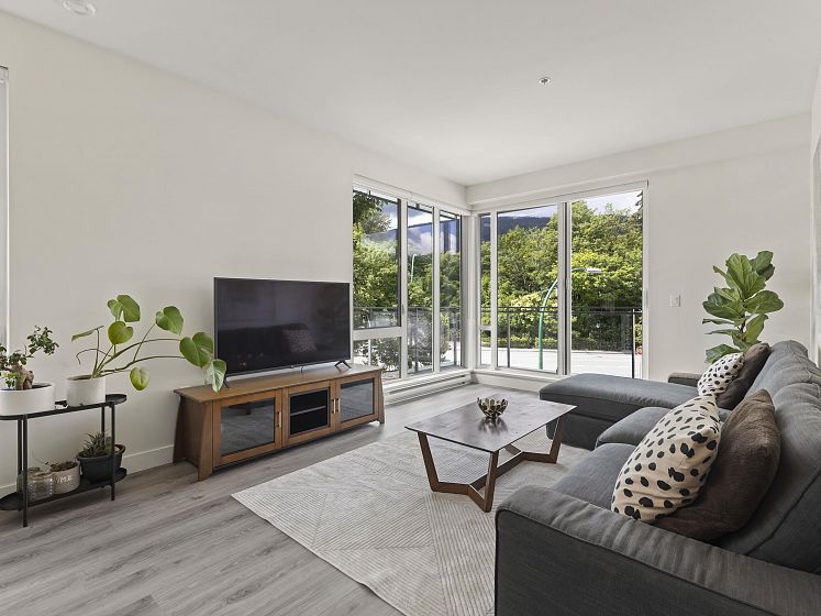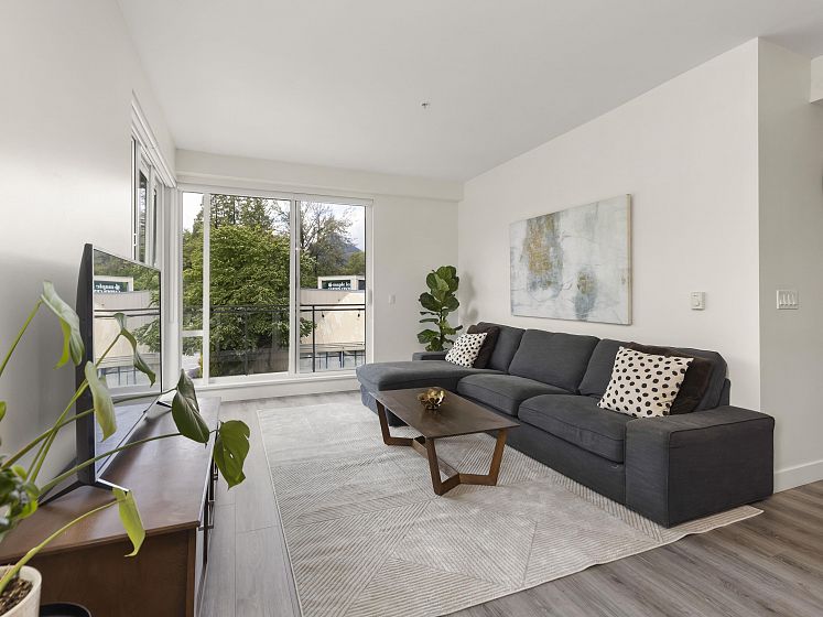 Walter's Place is the place to be in Lynn Valley! Floor to ceiling windows makes this 3 bed + 2 bath corner unit bright & welcoming. Fantastic layout- with a great flow from the foyer to the modern kitchen, lots of space for big family dinners in the dining room, & enjoy mountain views from your living room. 2 outdoor spaces- a balcony runs the length of the living space and then a private balcony off the main bedroom. Insuite Laundry, good closet space, incl walk through closet to ensuite. Well run & worry free + Pet friendly building + 2 parking.