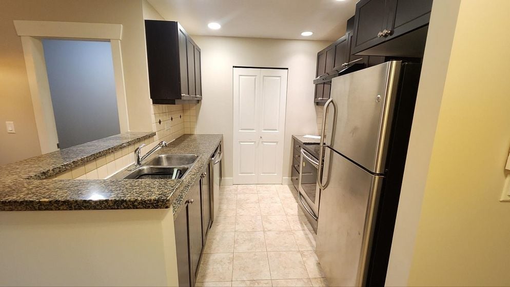 Reflections built by award-winning Adera. This 3 bed, 2 bath condo features an open, spacious floor plan, cherry hardwood floor in living room and dining room, bedrooms with brand new laminate flooring and large windows. Gourmet kitchen with S/S appliances and granite countertops. Gas fire place in living room. 9' high ceilings, newly painted walls and custom built pantry storage system. Enjoy a quiet, spacious patio for perfect entertaining and BBQs. Overlooking serene, private green space. Steps away to UBC neighbourhood, elementary, secondary schools and Old Barn community centre.