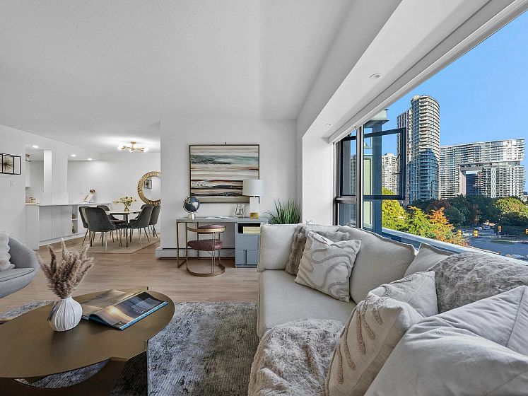 Spacious and thoughtfully designed, this 1,243 sq. ft. home offers an ideal layout with ample storage—perfect for a young family. Enjoy stunning views of False Creek from this beautifully updated residence in the heart of vibrant Yaletown. Just steps from the Canada Line and a short stroll to parks, grocery stores, banks, restaurants, and shops, this location combines comfort with unmatched convenience. Fully renovated in 2024, with the building lobby refreshed in 2017, the property boasts well-maintained amenities, including an indoor pool, jacuzzi, and fitness centre. The versatile 2-bedroom + flex layout or as well like presented a 3rd bedroom. Strata fees include heating, and internet, offering excellent value and ease of living.