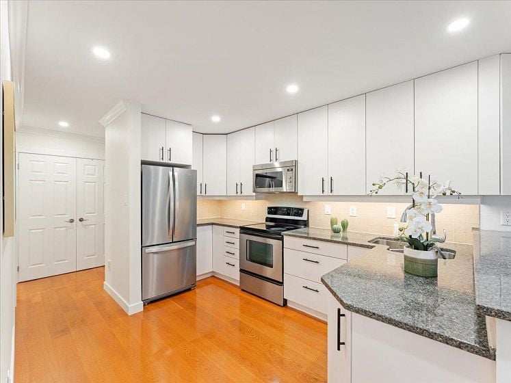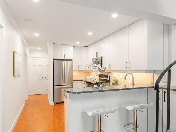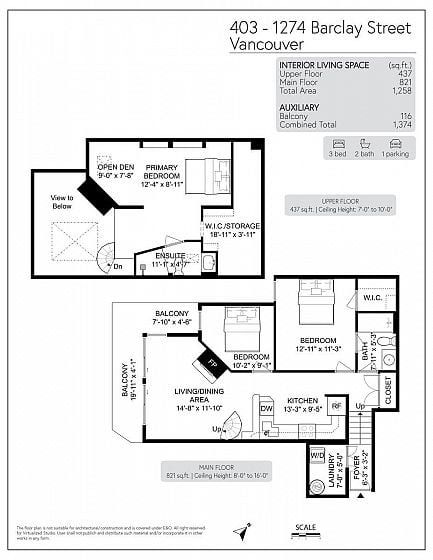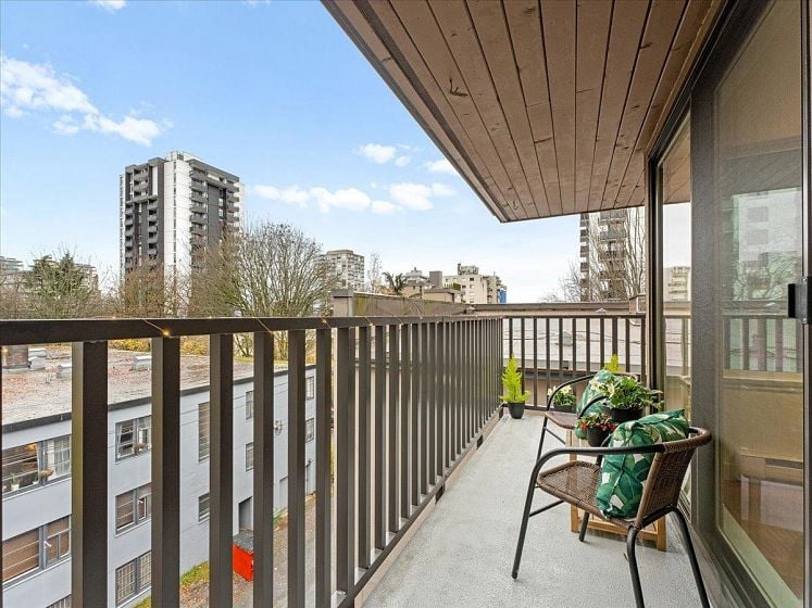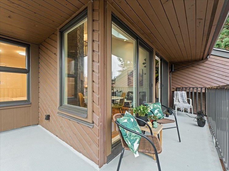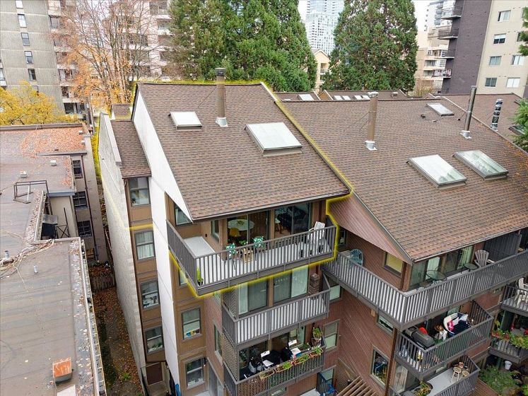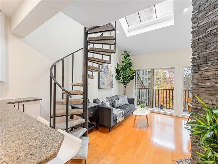 Rarely available top-floor 3 bed, 2 bath loft-style home in the heart of the West End. Soaring 15’ vaulted ceiling creates a stunning open living space, complete with a floor-to-ceiling stone fireplace & wraparound patio. The renovated kitchen features quartz counters, breakfast bar, extended wood cabinetry, S/S appliances & tile backsplash. Bathrooms are updated with new tile surrounds, vessel-sink vanities & stone counters. Freshly painted with new baseboards & light fixtures. Primary & 2nd bedroom have walk-in closets plus enjoy a large in-suite laundry & storage room. Barclay Square is fully updated with rainscreening, new windows, patio doors & brand-new balconies, with no upcoming major projects needed. Steps to English Bay, Robson Street & the Seawall.