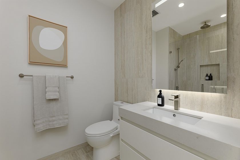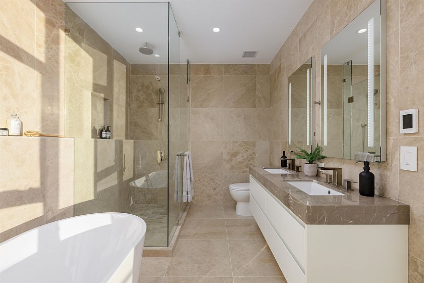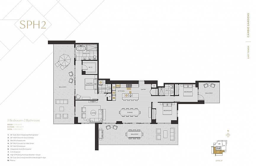 This South West facing 1705 SF spacious sub-penthouse Three-Bedroom home is located at Cambie Gardens, Onni Group's masterplanned community on Vancouver's westside. Lavishly finished w/ engineered HW flooring in bedrooms, heating & cooling system, automated lighting & sleek roller shades. A gourmet kitchen includes natural stone countertops, oversize waterfall island & premium Sub Zero + Wolf appliance package. Spa-inspired bathrooms boast marble countertops, Nuheat flooring & oversized mirrors w/ LED lighting. Bedrooms showcase walk-in-closets. Master ensuite includes 5-piece ensuite w/ double sinks, walk-in shower & soaker tub. Private double garage parking included.