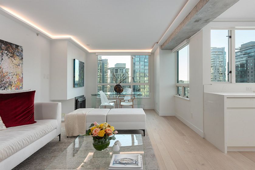 Welcome to Pointe Claire, a luxury high-rise nestled in the heart of Coal Harbour. No detail has been overlooked in this fully renovated, 3-bedroom, corner suite. This home features a thoughtfully designed open-concept layout, perfect for living, dining, and entertaining. The professional renovation includes hardwood flooring, brand-new stainless steel appliances, marble/quartz countertops, energy-efficient electric baseboards, modern lighting fixtures and more. Spanning nearly 1200 SOFT, enjoy breathtaking views from your floor-to-ceiling windows of the marina, city and sunsets. Just steps from the seawall, Stanley Park, and top amenities. Book your private viewing today!