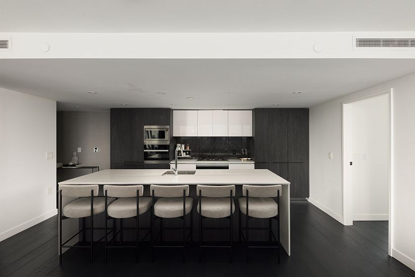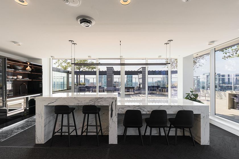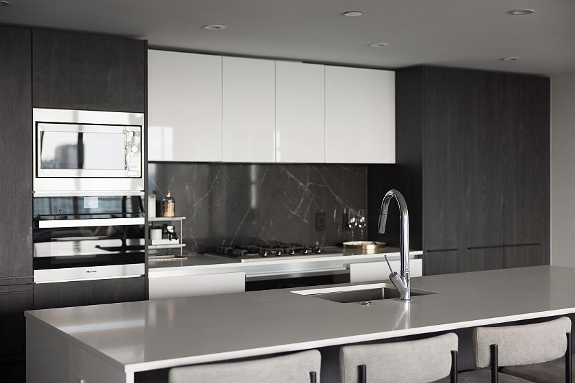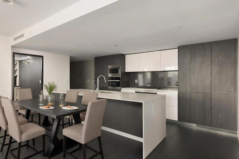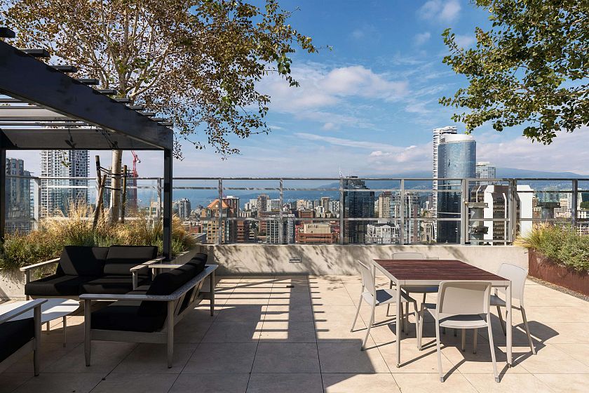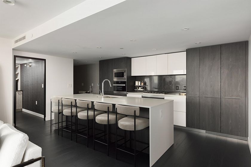 Elevated & updated corner home at 8X on the Park with panoramic views of False Creek, city, and mountains. This refined 3 bed, 2 bath residence features a 10ft natural stone island, integrated Miele appliances, custom millwork, powered blinds, and floor-to-ceiling windows. The open plan flows to an oversized covered patio with herringbone wood decking. Elegant bedrooms, a reimagined walk-in closet, engineered hardwood, natural tile, & A/C throughout complete the home. Includes 2 side-by-side parking, storage, and bike locker. Enjoy world-class amenities: concierge, fitness centre, and rooftop oasis. A rare, turnkey offering in one of Vancouver's premier buildings.