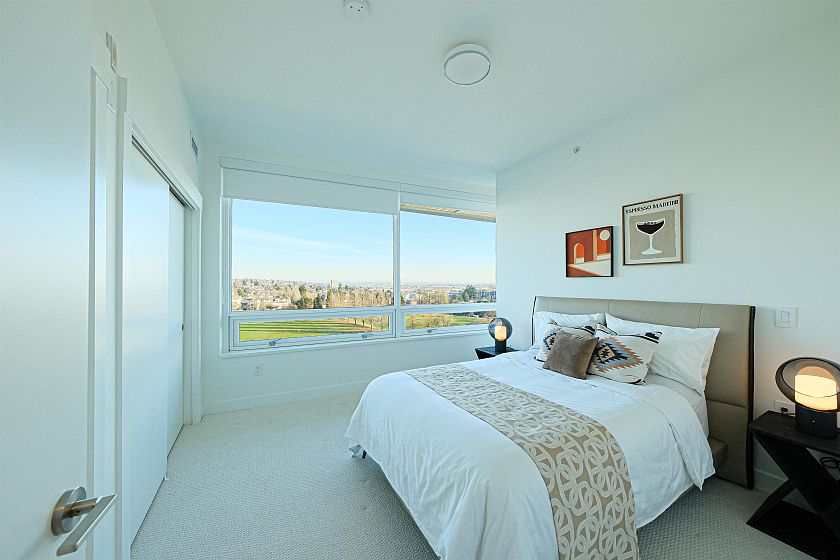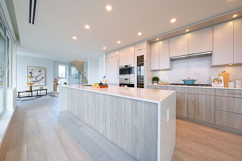 Unique and priceless 360 Degree View! PENTHOUSE NE CORNER unit, 3 bathrooms 3 bathrooms,2 living rooms, rooftop patio 801sf. The gourmet kitchen is equipped to host any event, offering a generous dining area ,Premium finishes throughout include a Wolf gas cooktop, integrated SubZero fridge, quartz countertops with a waterfall edge, wine cooler, bar seating, A/C, engineered hardwood floors, and non-adjacent bedrooms with walk-in closets and ensuites with heated floors. All 3 brs direct access to with breathtaking views of the Winona Park, rooftop patio has City & Mountain& park and water view. Ideally located in South Cambie, close to Oakridge, QE Park, Marine Gateway (T&T), Langara, and the Canada Line.Two Parking included.