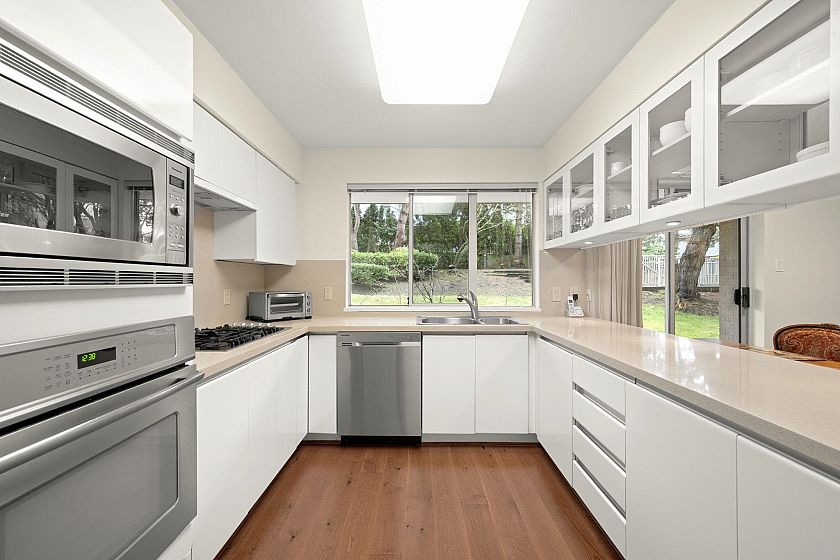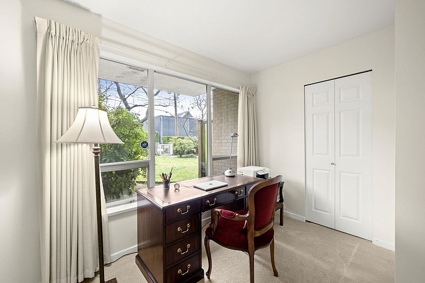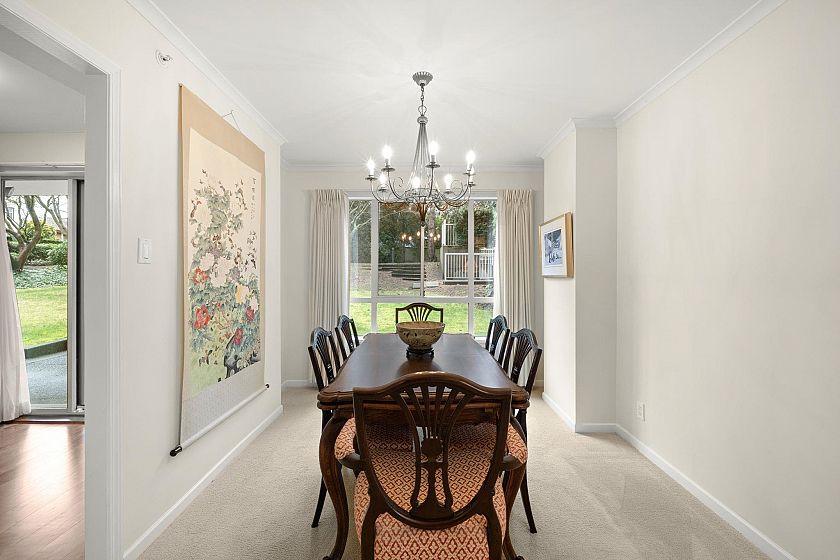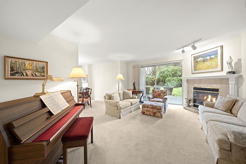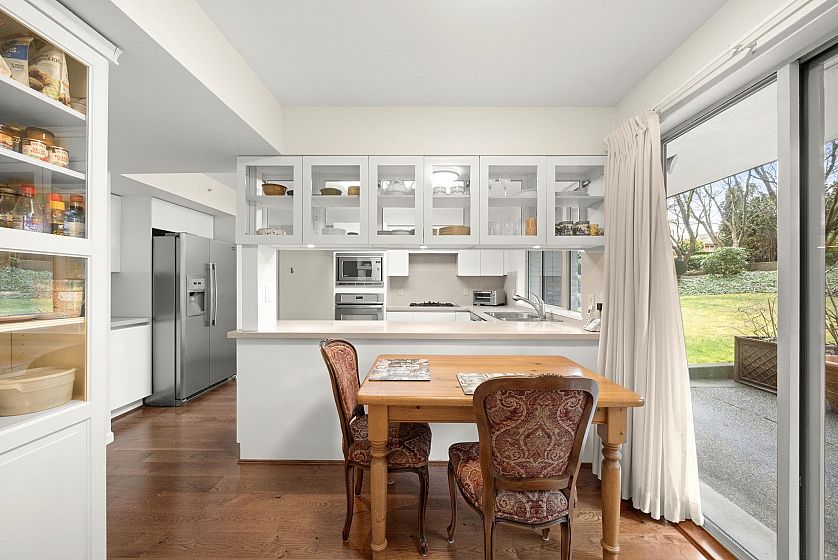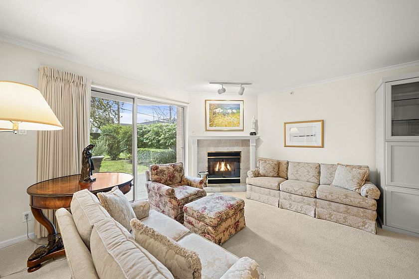 Very rare sunny ground floor luxury garden unit in the beautifully maintained 27 unit boutique building, "Kerrisdale Parc'. Extensive garden outlook from all windows facing east & south. 3 private patios (729 SF) , 2 underground car spaces. Full size kitchen & in-suite laundry. Partial wheel chair accessible & planned with two wings, perfect for taking care of elderly parents or guests. The living room's open gas fireplace adds 'cosy' to the in-floor heating system. New screen doors & updated kitchen countertop incl gas stove adds to the comfort & capacity of this elegant home with a supportive & harmonious Strata Council. Located on the UBC rapid express bus line & surrounded by Vancouver's best schools & the popular Arbutus Greenway, it is known as a walker's & biker's paradise.