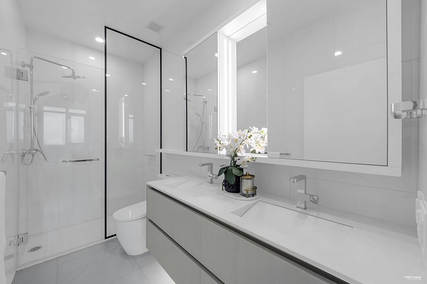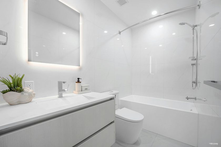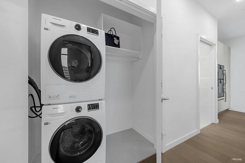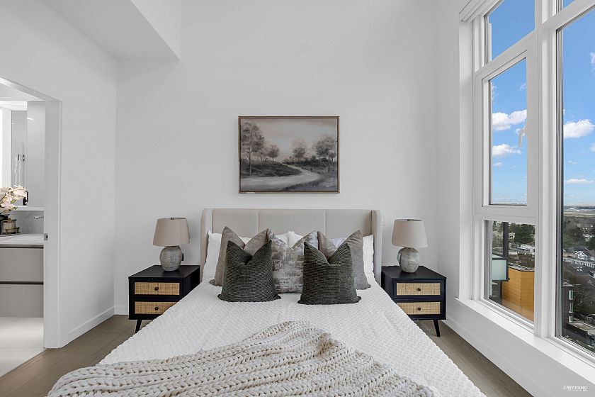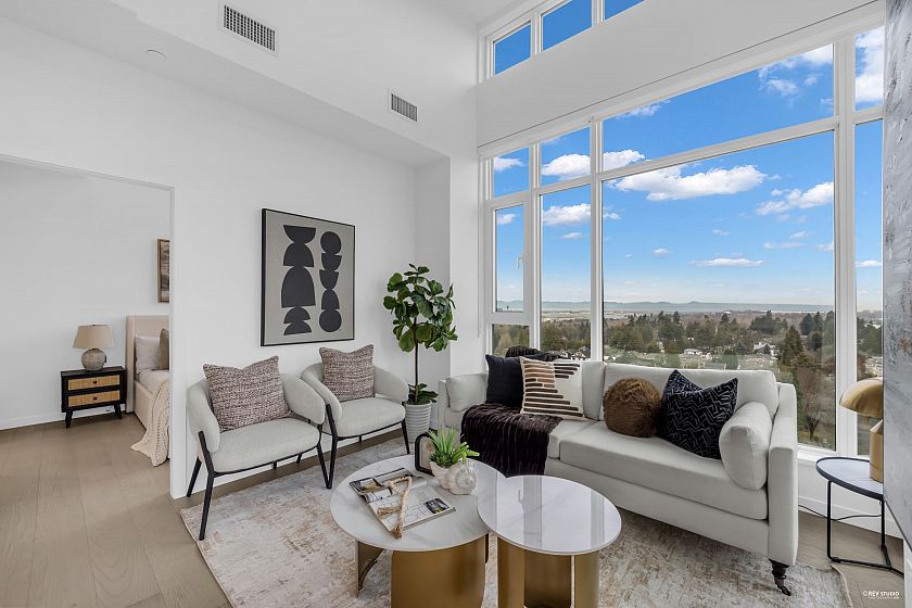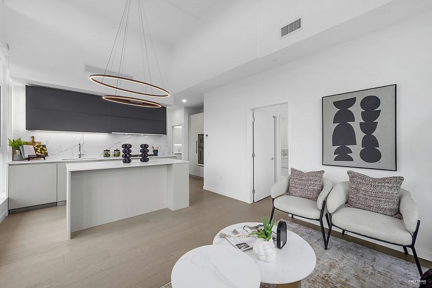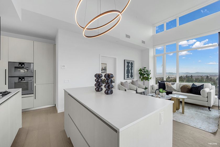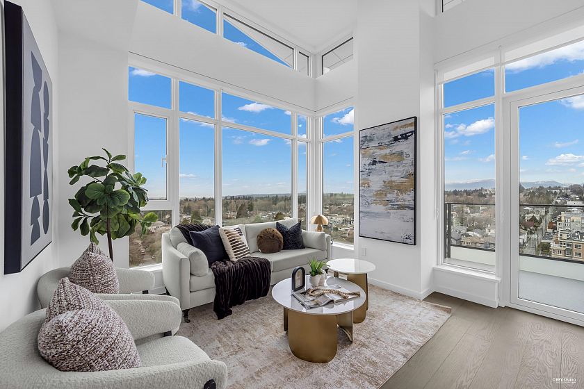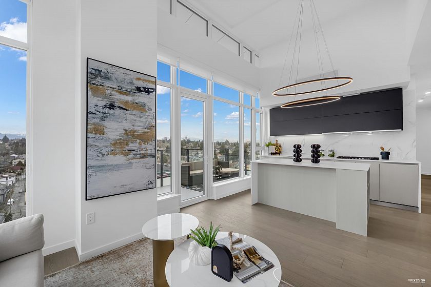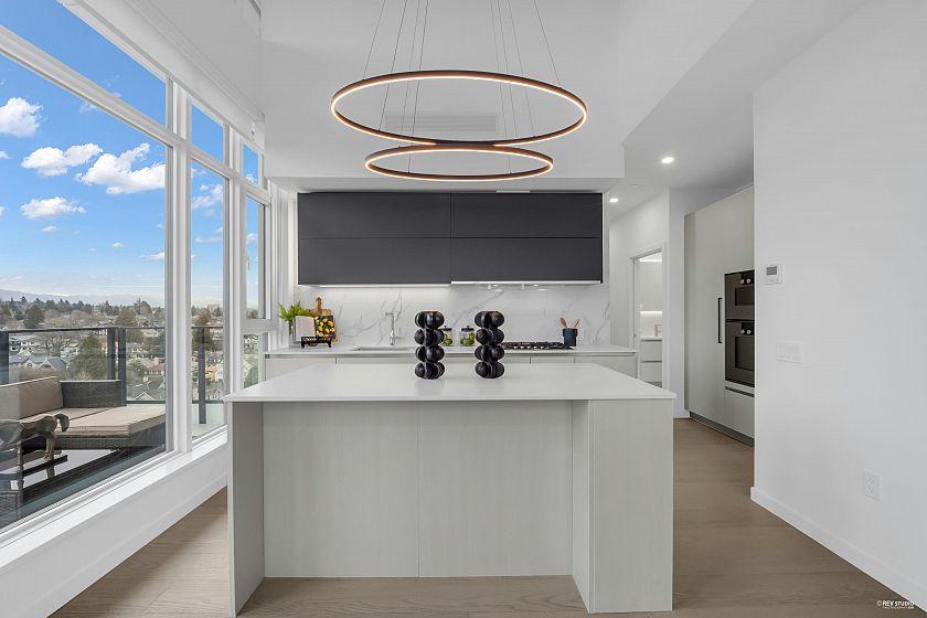 Occupying a prime corner position at the top of the building, this exceptional Penthouse 3 Bed + Den residence captures sweeping views toward distant mountains and water, offering a rare unobstructed outlook with views from every window. A dramatic 14-foot ceiling height enhances the sense of scale, while expansive windows draw in natural light and reinforce the home’s open, airy atmosphere. Principal living spaces are oriented to embrace surrounding scenery, maintaining a strong visual connection to the landscape. The kitchen features a full Gaggenau appliance package, reflecting the premium standard of this top-floor home. Located within W68 by Westland Living at Granville & W 68th. A rare top-floor offering defined by light, scale, and views.