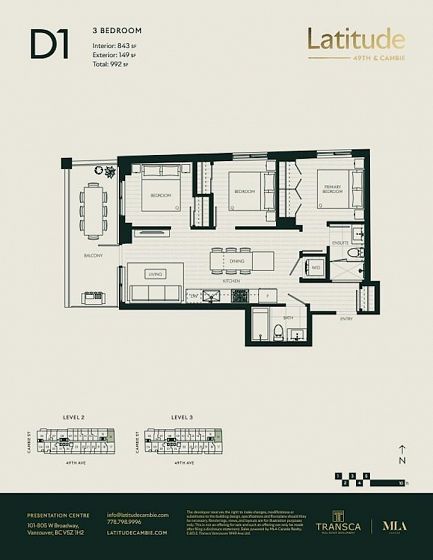 Thoughtfully designed for West Side living, this 3 bedroom home at Latitude is located in Vancouver's Oakridge neighbourhood at Cambie Street and West 49th Avenue. Steps from the Canada Line with quick access to Downtown, Oakridge, and YVR, the home features a 149 sq ft private patio ideal for outdoor living. The kitchen showcases European-inspired cabinetry, premium Miele appliances, and a custom 6' extendable island dining table designed for everyday dining and entertaining. Smart living is enhanced with the Mosino smart entry system integrated with an Ecobee thermostat and Hilo Smart Mirror. Residents enjoy access to a fitness centre, dining lounge with outdoor BBQ, children's playground, on-site childcare, and study rooms.