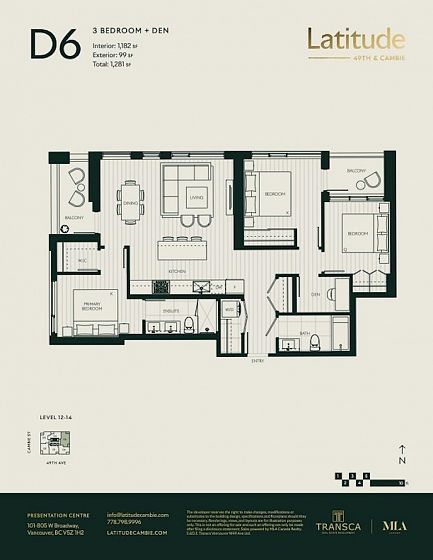Designed for West Side living, this 3 bedroom and den home at Latitude is located in Vancouver's Oakridge neighbourhood at Cambie Street and West 49th Avenue. Steps from the Canada Line with quick access to Downtown, Oakridge, and YVR, the home features refined detailing throughout. The kitchen includes smoked glass cabinetry, premium Miele appliances, and a custom 6' extendable island dining table. Additional highlights include Radiant heated ensuite flooring, a towel warmer, custom millwork, and smart living with Mosino entry, an Ecobee Thermostat, and a Hilo Smart Mirror. Residents enjoy access to a fitness centre, dining lounge with outdoor BBQ, children's playground, on-site childcare, and study rooms.