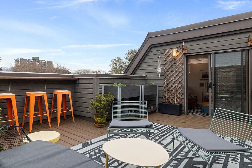 Kits living at its best! Imagine ending your day with sunset BBQs on your private rooftop retreat featuring breathtaking ocean & mountain views. Open kitchen with new appliances, floor-to-ceiling maple & glass cabinets, and granite counters. Spacious living/dining with dramatic double-height ceilings, skylight, and multiple windows flooding the space with natural light. Bamboo flooring throughout. 2 generous bedrooms + updated full bathroom & in-suite storage on main. Upstairs loft perfect as 3rd bedroom, home office, flex space, or art studio. Boutique building steps to Kits Beach and situated on the vibrant W 4th Avenue shopping district with its acclaimed shops and restaurants. Grab a morning coffee at Provisions & groceries at Whole Foods, all at your doorstep. Live the kits Dream.