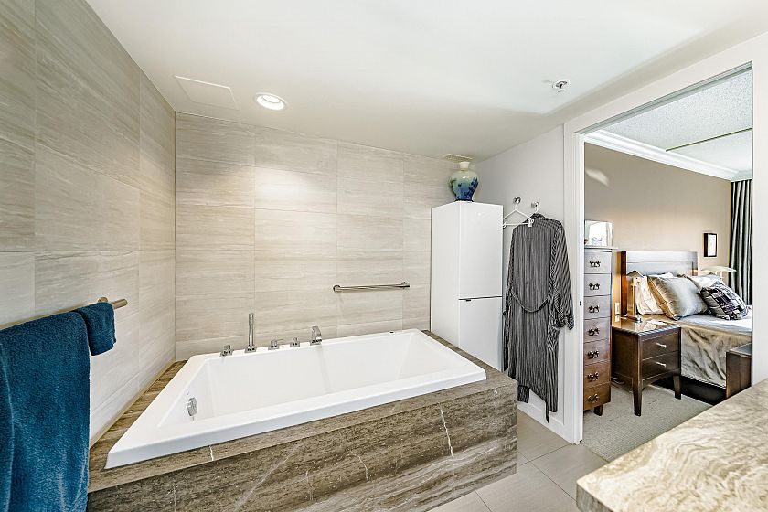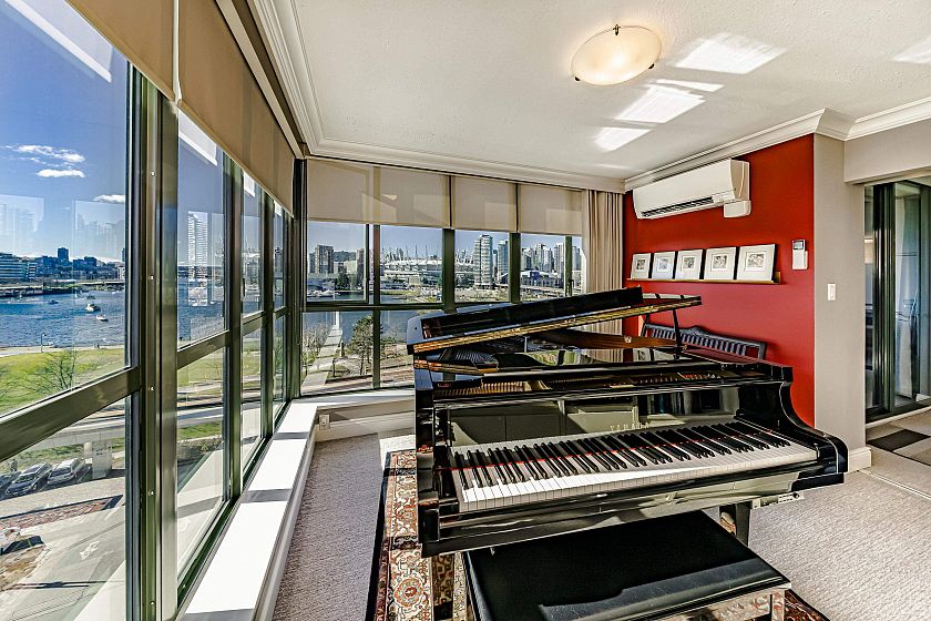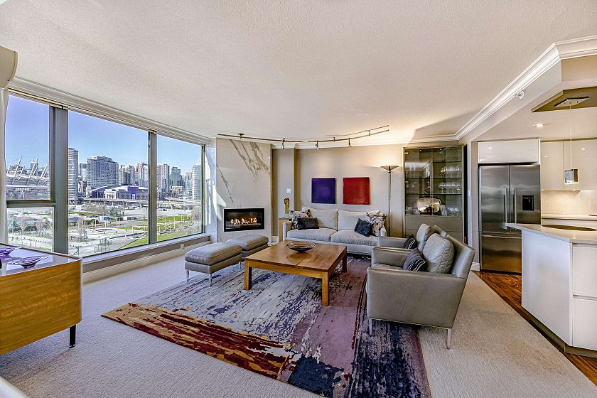 Spectacular 180* views of False Creek Waterfront, Mountains, Olympic village, Cityscapes and Sunsets from this large 1484 sq.ft. 3 bedroom condo. Water Views from all living areas and bedrms. Fully renovated with top of the line appliances and materials. Bright open modern kitchen has European cabinets, Caesar stone counters, built-in steam oven, induction cook top, breakfast bar. Entry and kitchen have Merrato solid hardwood floors, and living/dinning areas have "wool" wall to wall carpeting. Newer modern gas fireplace. Front corner bedrm/Familyrm has stunning "custom cast" floor to ceiling Glass door. Just steps to the seawall and all that this beautiful location and city have to offer. New St. Paul's Hospital is 1 Blk away.