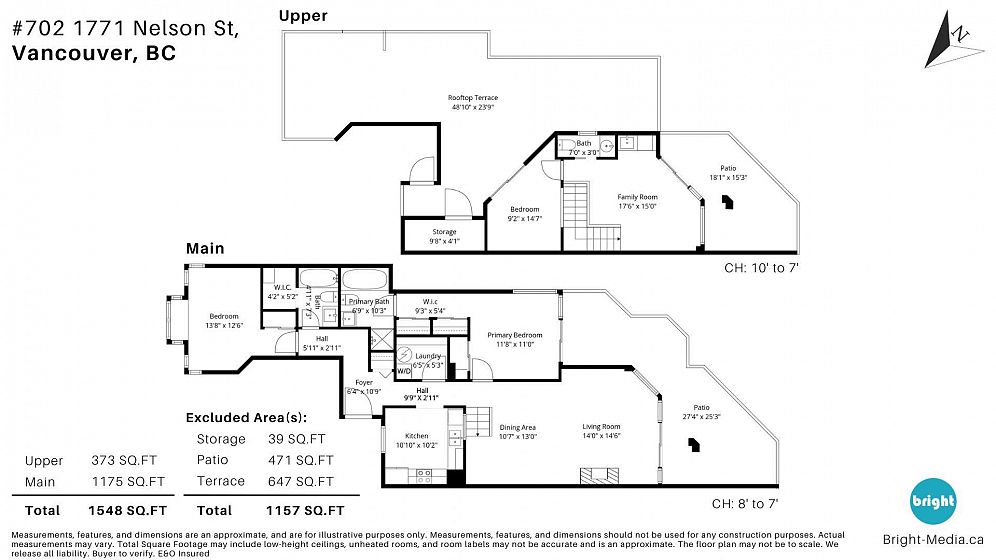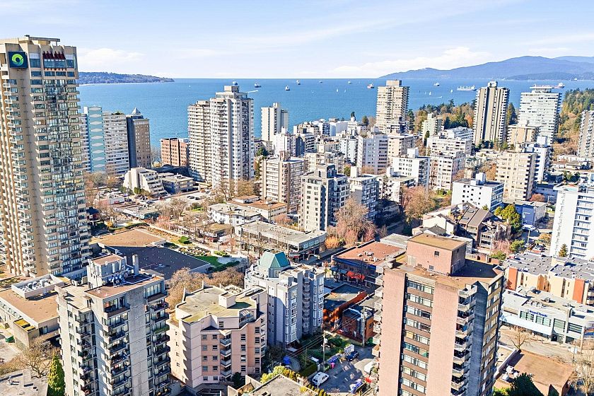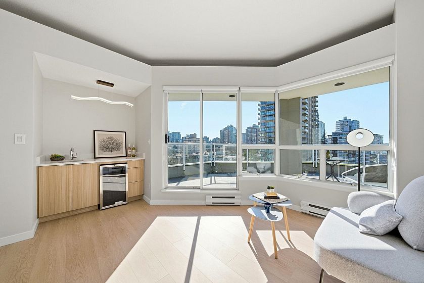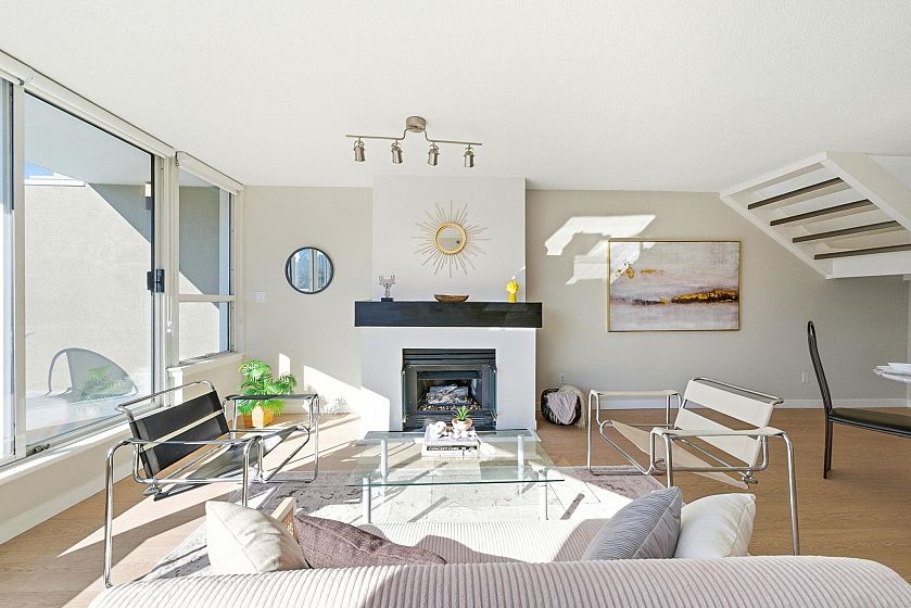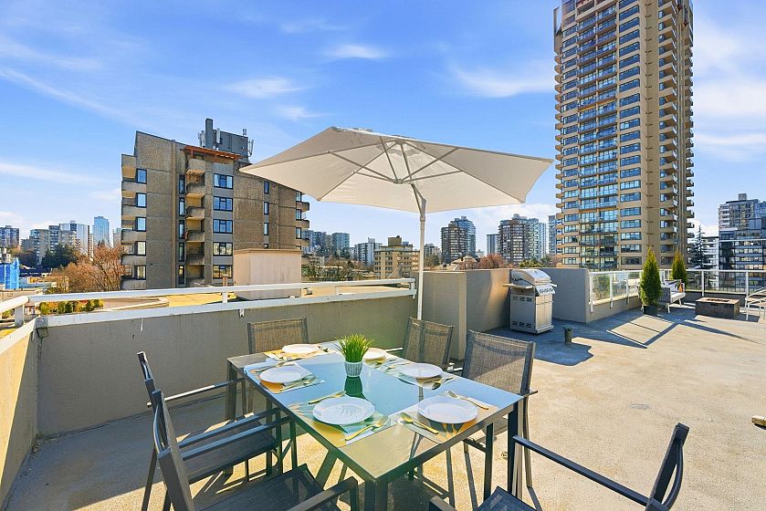 SPECTACULAR WEST END PENTHOUSE WITH OVER 1,100 SQFT OF PRIVATE OUTDOOR SPACE. Nearly 1,550 sqft over 2 levels w/ sweeping views of English Bay & the North Shore mountains. The main level features open living w/ gas fireplace, striking floating staircase & access to a south-facing wraparound patio. The primary suite is on the main w/ ensuite, generous closets & patio access, plus a large second bedroom, kitchen & laundry. Upstairs offers a third bedroom, powder room & flex space w/ built-in wine fridge opening to another patio & a rooftop terrace perfect for entertaining w/ mountain, city & water views. Watch fireworks, sunsets & sunrises from your private outdoor retreat! Boutique building steps to English Bay, the seawall, Stanley Park & restaurants along Denman & Robson. 2 parking incl.