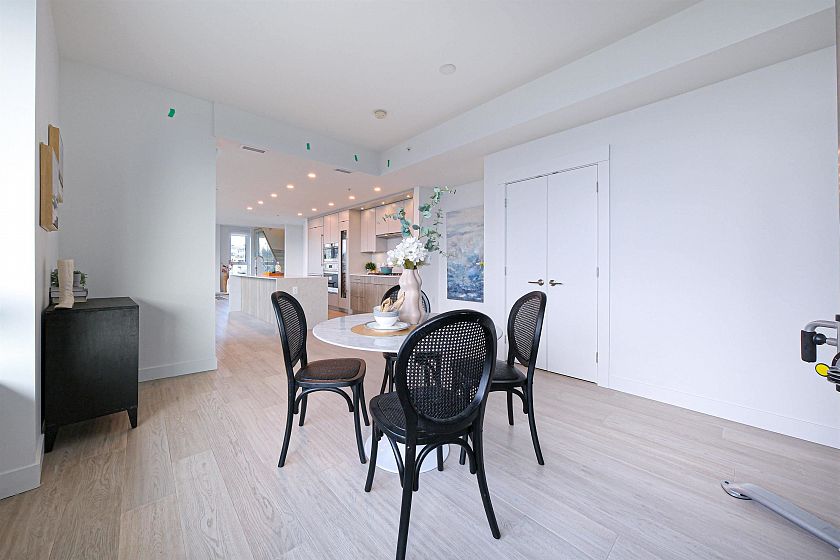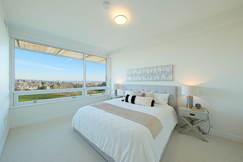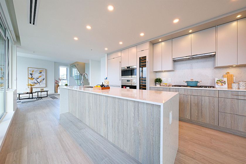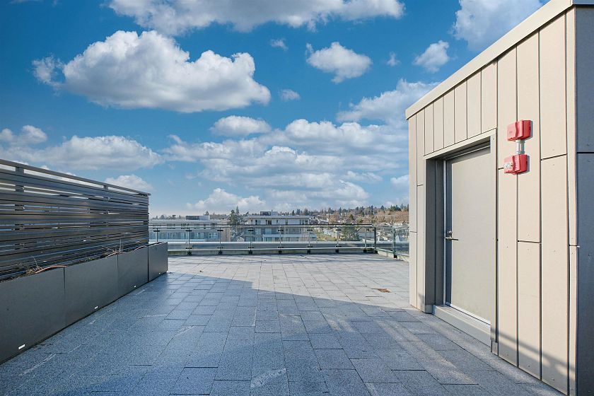 Unique and priceless 360 Degree View! PENTHOUSE NE CORNER unit, 3 bathrooms 3 bathrooms,2 living rooms, rooftop patio 801sf. The gourmet kitchen is equipped to host any event, offering a generous dining area ,Premium finishes throughout include a Wolf gas cooktop, integrated SubZero fridge, quartz countertops with a waterfall edge, wine cooler, bar seating, A/C, engineered hardwood floors, and non-adjacent bedrooms with walk-in closets and ensuites with heated floors. All 3 brs direct access to with breathtaking views of the Winona Park, rooftop patio has City & Mountain& park and water view. Ideally located in South Cambie, close to Oakridge, QE Park, Marine Gateway (T&T), Langara, and the Canada Line.Two Parking included.