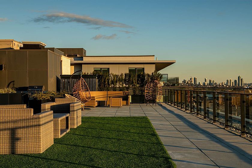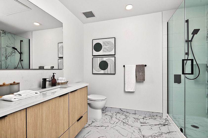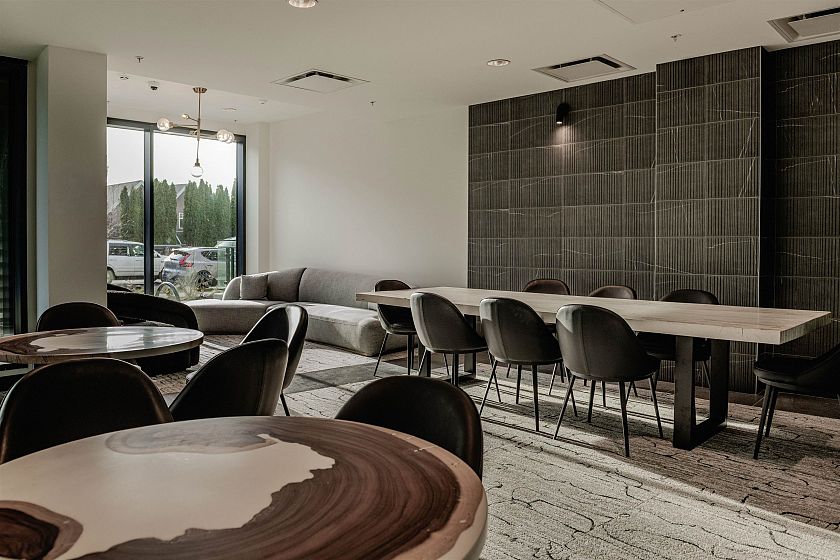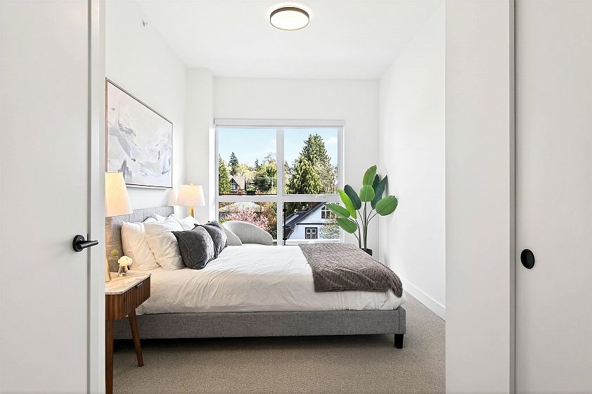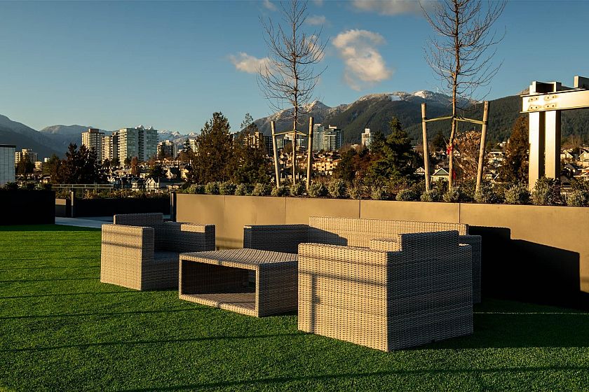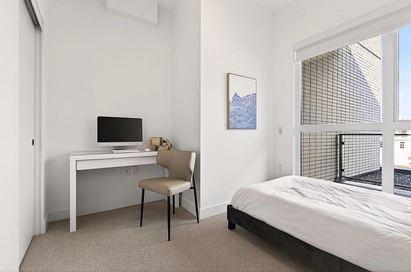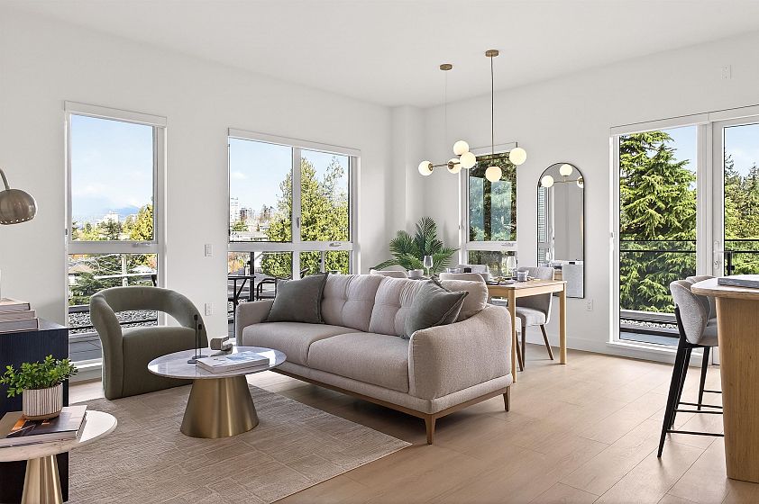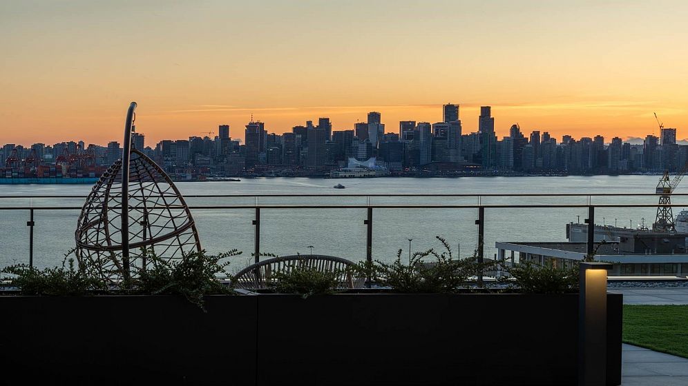 New 3-bed suite offers quiet, turnkey living in a high-quality concrete, mixed-use building in Lower Lonsdale. Northwest exposure with floor-to-ceiling windows offers ample natural light, mountain, & water views, while concrete construction delivers excellent acoustic separation. Considered layout includes, spacious entry & closets, generous living and dining areas, a refined kitchen with integrated Fisher/Paykel appliances, quartz countertops, pantry storage, & laundry. Expansive wrap-around balcony gives mountain/water views. The king-sized primary includes large closets, spacious ensuite, and accessible design. Air-conditioned and move-in ready. Amenities: landscaped rooftop with gardens, BBQ, & lounge areas. Co-working/lounge spaces at grade. 1 parking with EV avail. as upgrade. (+GST)