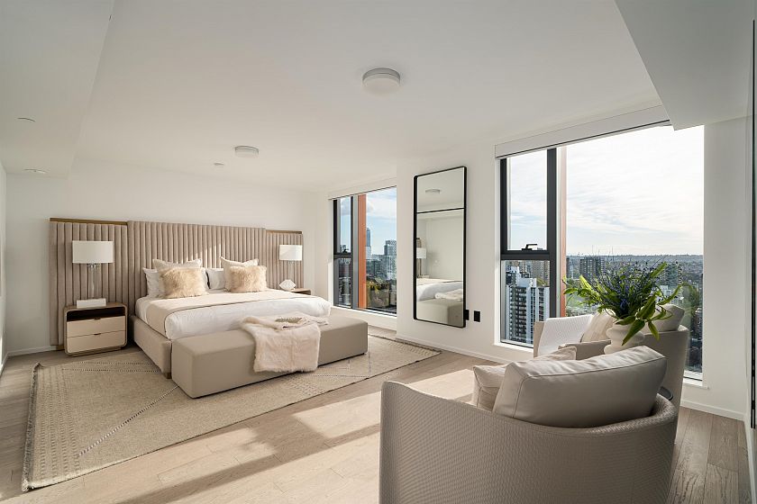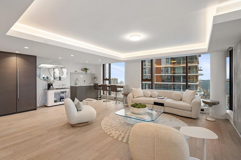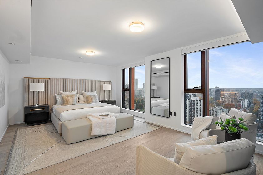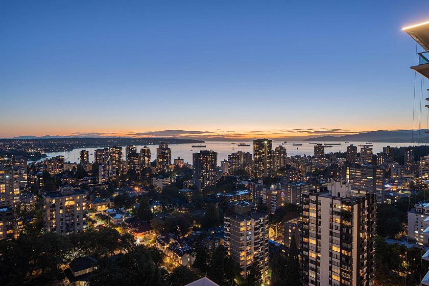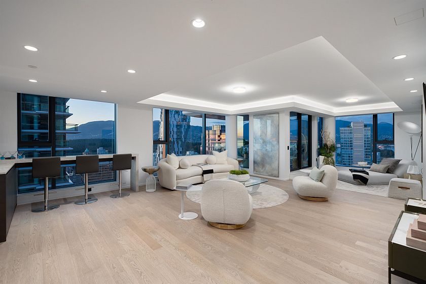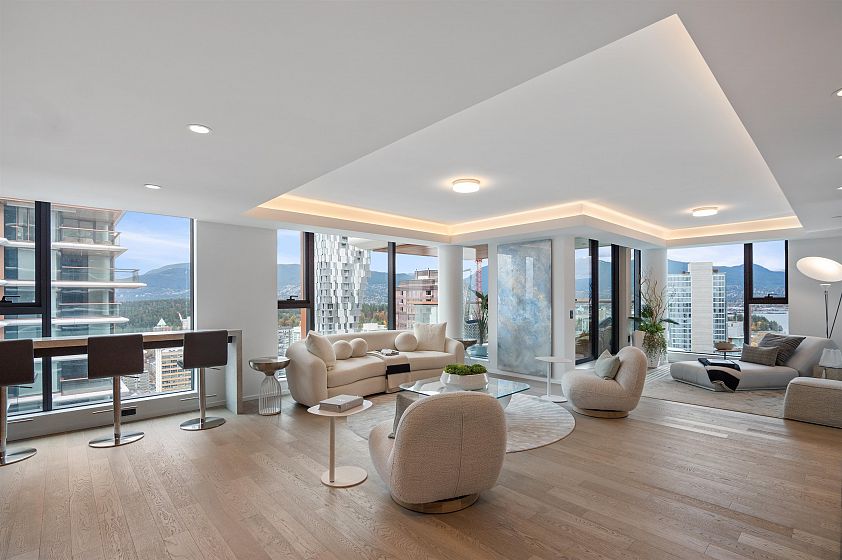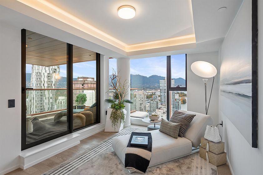 A Masterpiece in the Sky! This stunning Ikebuchi-designed residence features 4 bedrooms, 4 bathrooms and boasts over 300° of panoramic wraparound views of Vancouver’s city, ocean & mountain. Offering near 2800 sq.ft. of combined bright indoor/outdoor living, this home is an entertainer’s dream with 2 expansive terraces and luxurious custom finishes throughout. Enjoy Gaggenau appliances (including 3 refrigerators), custom wood walls & closets, integrated cove lighting, motorized blinds, and a spacious primary suite with dual closets & a spa-inspired ensuite. Exclusive access to Club Robson’s 18,000 sq.ft. of world-class amenities including an ozone pool, fitness & yoga centre, and 24-hr concierge. Additional highlights include 2 private double-car garages and 2 private storage rooms.