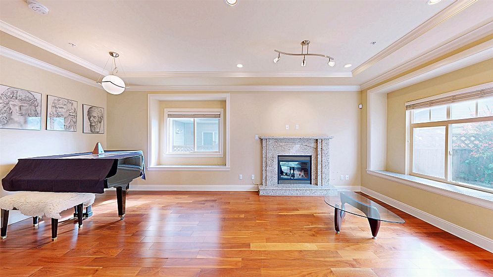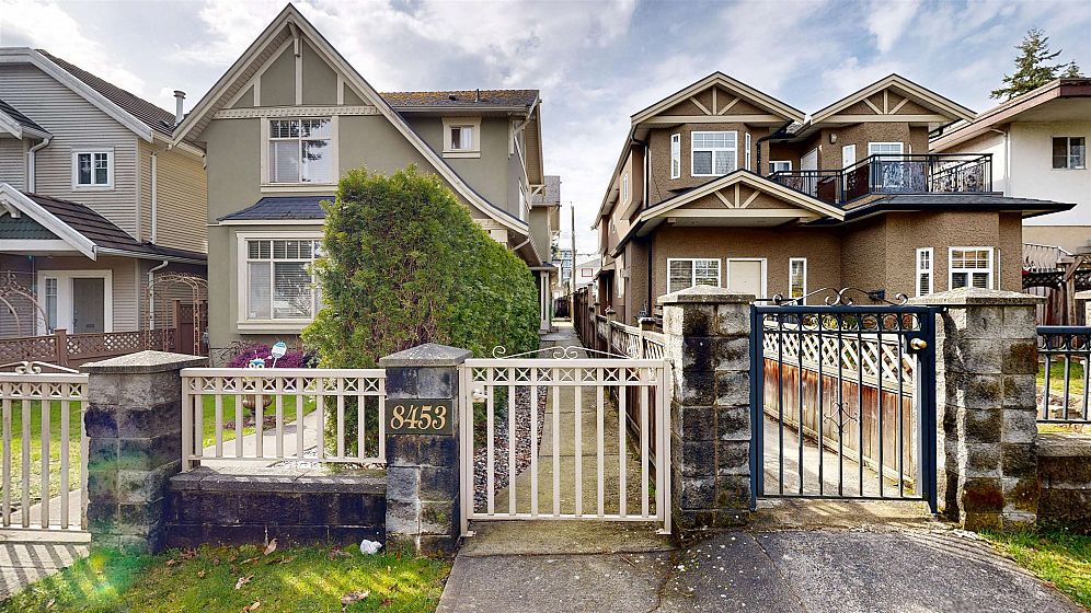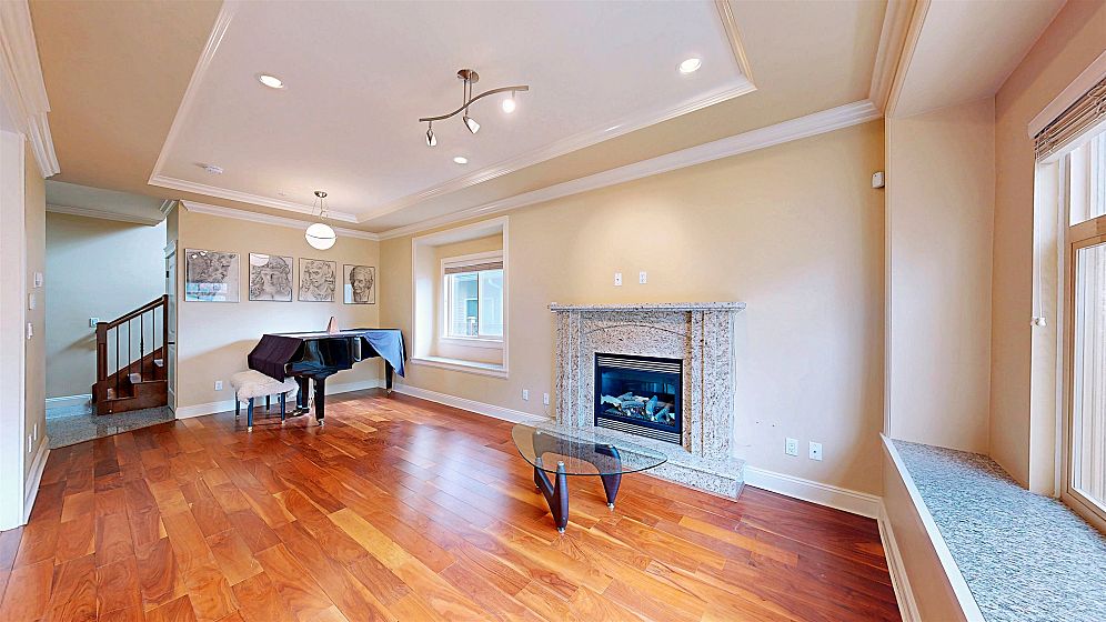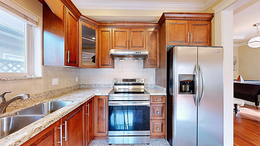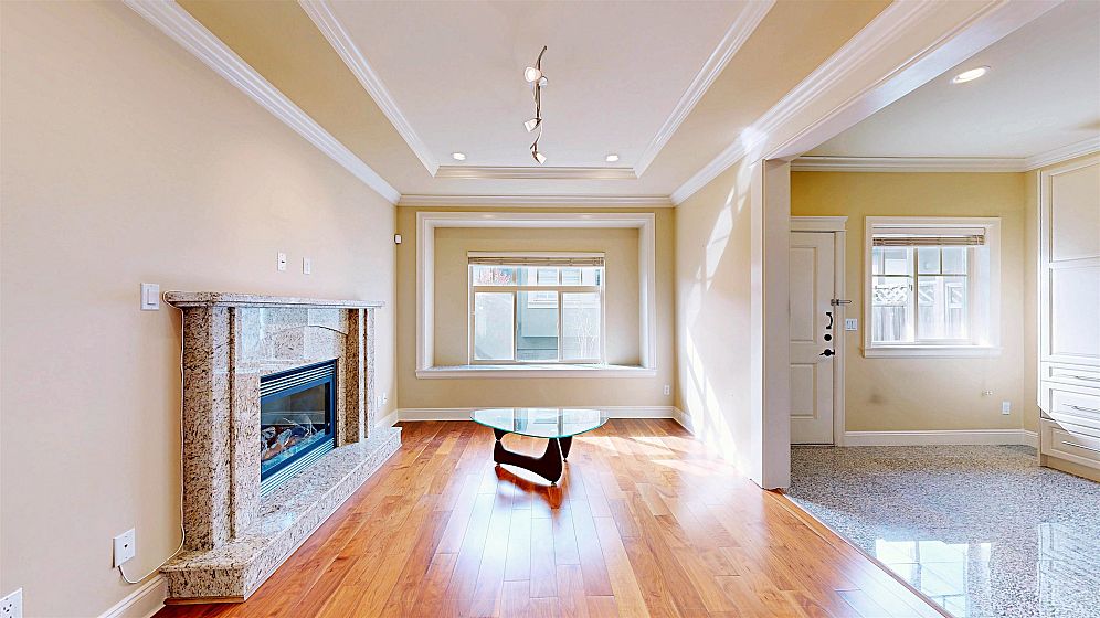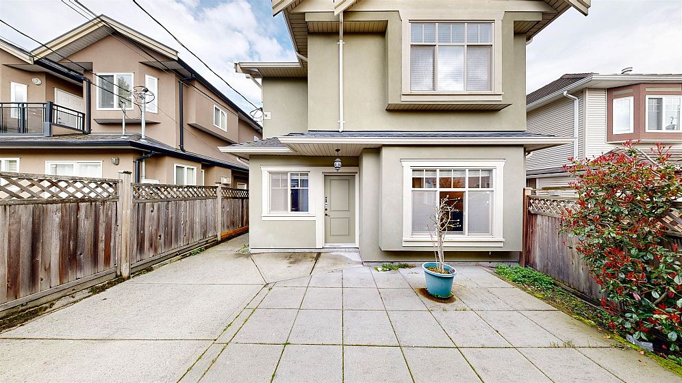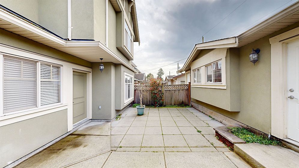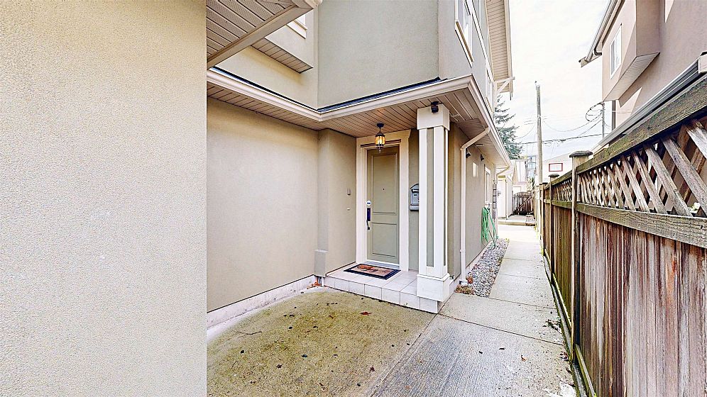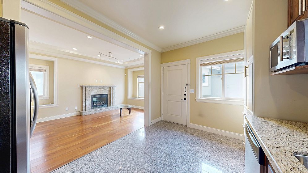 Exceptional value in this quiet, bright, well-kept stunning 1/2 duplex back unit in a highly sought-after neighborhood. This luxury residence offers a garage and a private, spacious garden patio for outdoor enjoyment. Spanning over 1,300 SF across two levels, this beautifully designed home features bright and comfy 3 beds and 3 baths, 9' ceilings on the main floor, open kitchen, dining and living area with granite counters, fireplace, ample cabinetry for storage, granite and wood flooring, and quiet radiant heat. Includes a custom Murphy bed with wardrobe and worktable. Newer appliances. Steps to Marine Gateway, shopping, restaurants, and Marpole Community Center, Canada Line and public transit. Located in the Laurier Elementary and Churchill Secondary catchments. Measurement approximate.