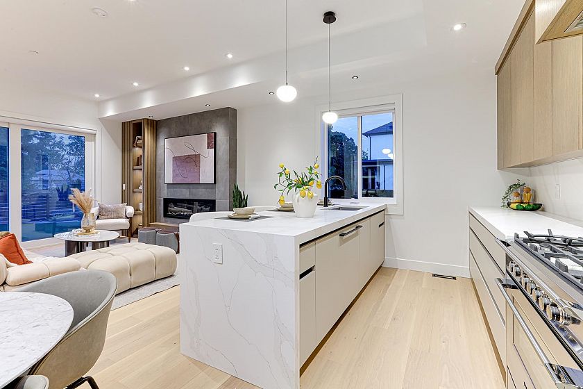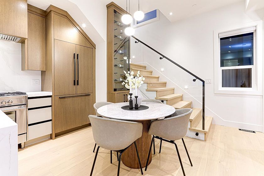 Experience elevated living in Mount Pleasant! This smart contemporary 1/2 duplex exudes sophistication with its open-concept design, gourmet kitchen (Fisher & Paykel appliances, gas range, quartz counters, oversized island), and sunlit living/dining spaces framed by sleek glass patio doors. Upstairs, 3 spacious bedrooms with ensuites and a walk-out balcony offer comfort and style. Premium extras include Control4 automation, motorized blinds, central A/C, HRV, heat pump, built-in vacuum & security system—all in the sought-after Dickens catchment near vibrant Main Street.
