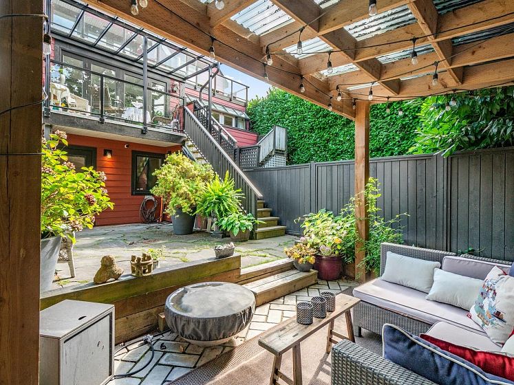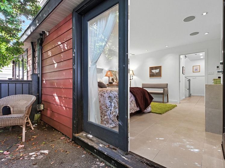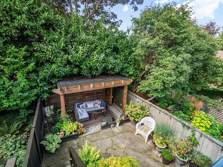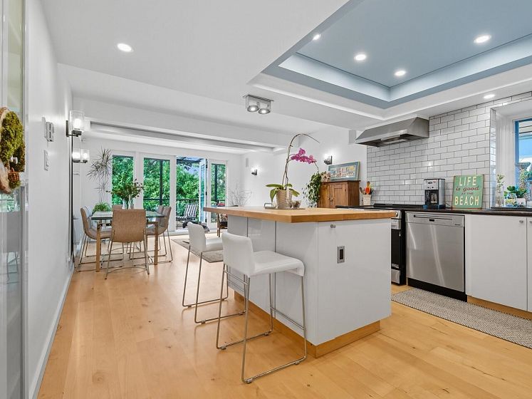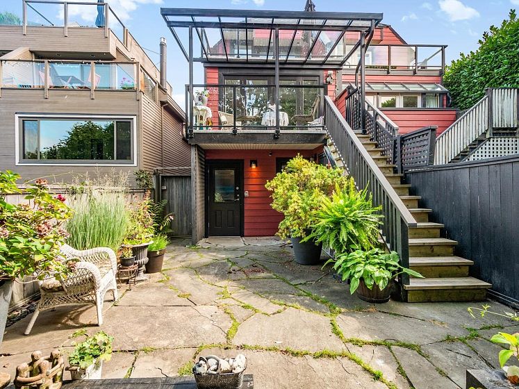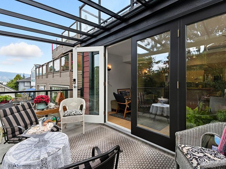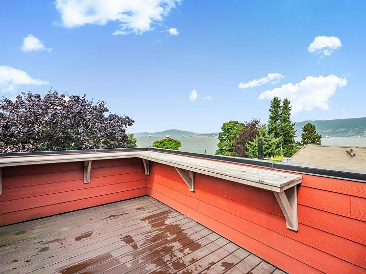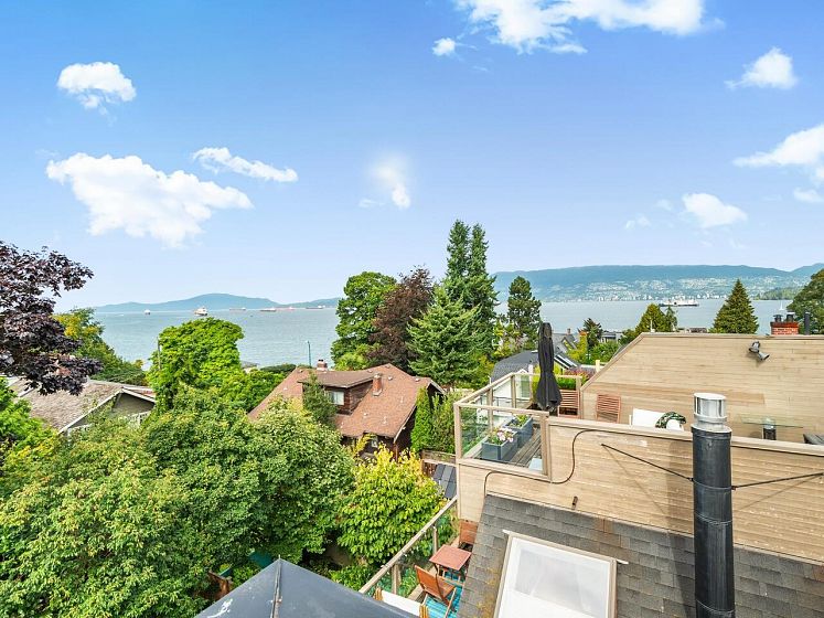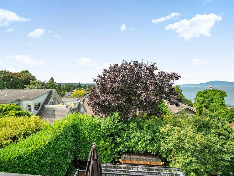 Rare offering north of 4th! This stunning 3 bed + den, 3 bath ½ duplex boasts over 1,700 sqft of light-filled living just steps to the beach, shops, cafés & restaurants. Expansive water & mountain views from the living room & private rooftop deck make this home truly one of a kind. Elegant open-concept design features stone counters, alder floors, spa-inspired baths w/heated floors & steam shower, and seamless indoor-outdoor flow with French doors to a fully fenced stone patio. The versatile den offers potential for a home business, guest suite, or income helper. Shared garage w/Tesla charger plus ample storage. Exclusive, quiet setting in one of Vancouver’s most coveted neighbourhoods—this home is a must see, offering the ultimate West Coast lifestyle.