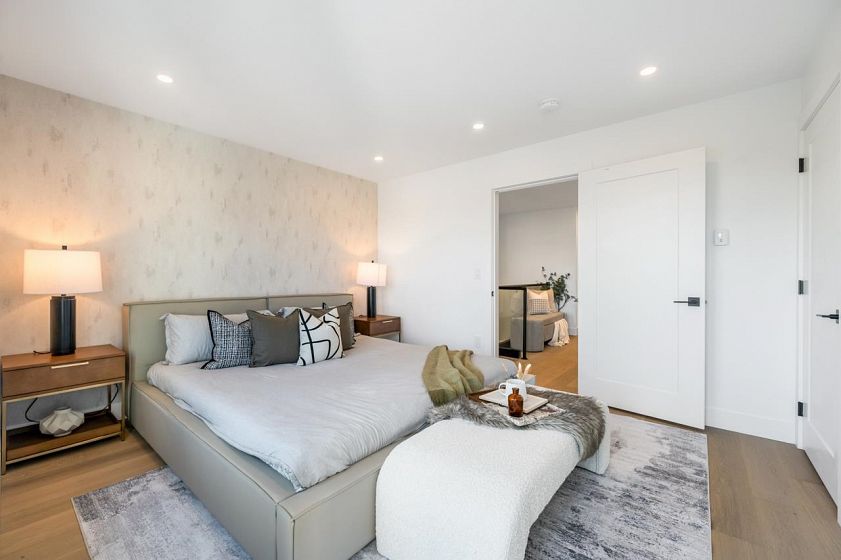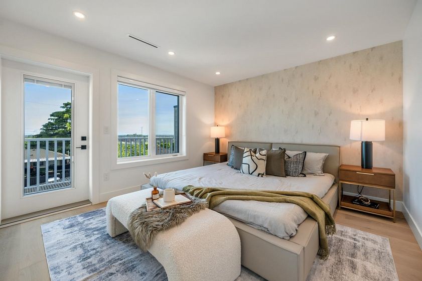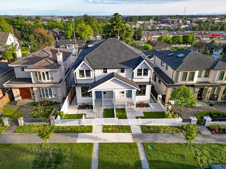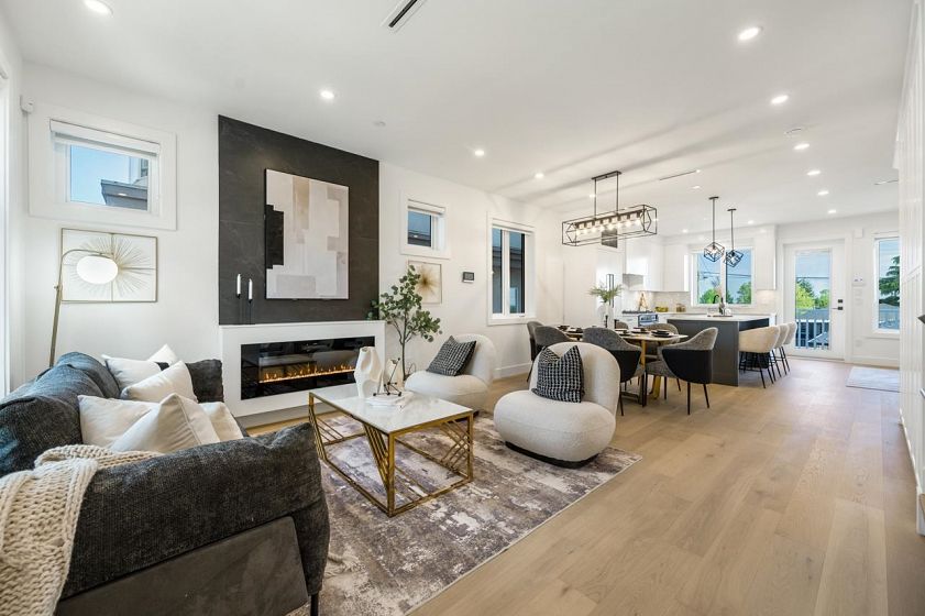 FRASERVIEW Side by Side duplexes on a prized 49x122 LOT SIZE. These homes embody exceptional craftsmanship & sophistication. Features 3 bdrms on the upper floor with additional bedroom for owners use in the basement & 1 bdrm WALK OUT legal suite. Inside, you'll find white oak hardwood floors, high ceilings, and an open-concept design that creates an airy, inviting atmosphere. Bright white shaker style cabinetry with integrated Fisher Paykel appliances including a 36 INCH GAS RANGE, WINE COOLER & EXTRA LARGE PANTRY. Other features include TANKLESS HOT WATER on demand GAS BOILER, Radiant heating, AC/Heat Pump systems for year-round comfort & No Sump Pump. Sunny South facing backyard. Sir James Douglas (French Immersion) & David Thompson Secondary.