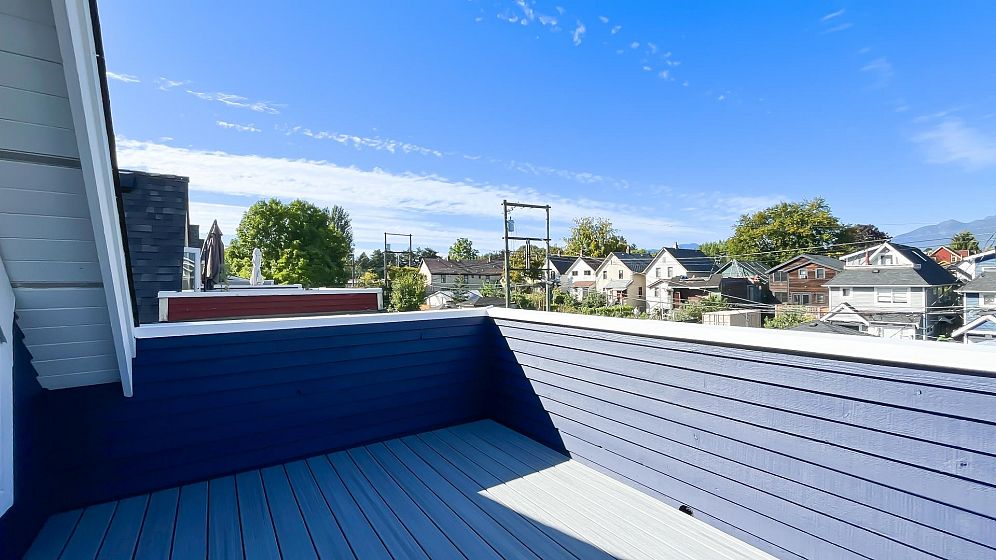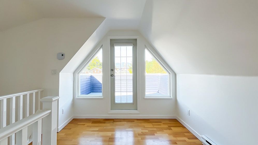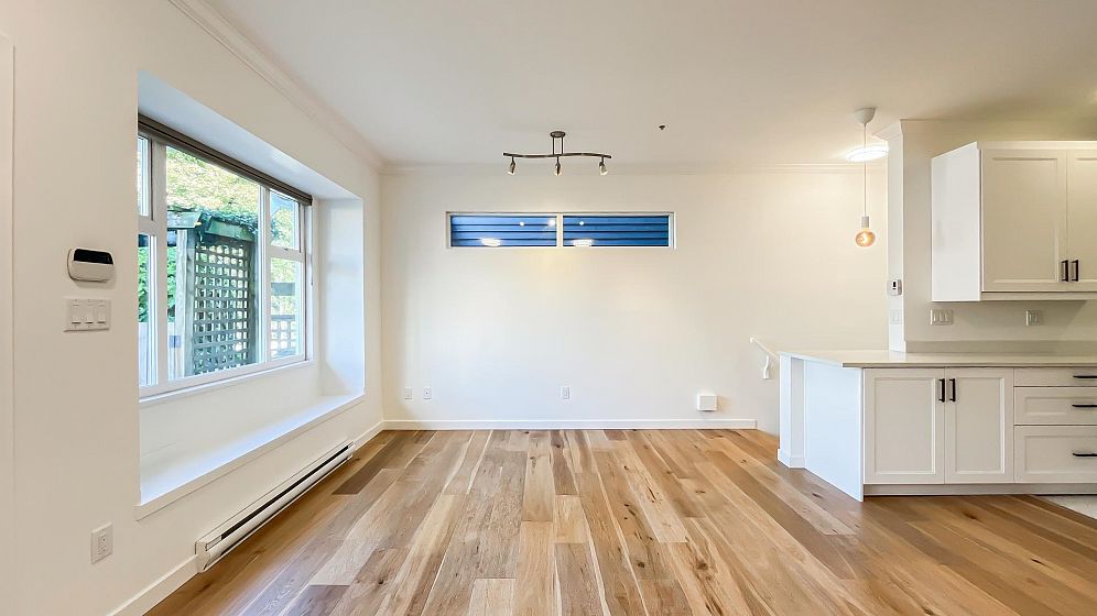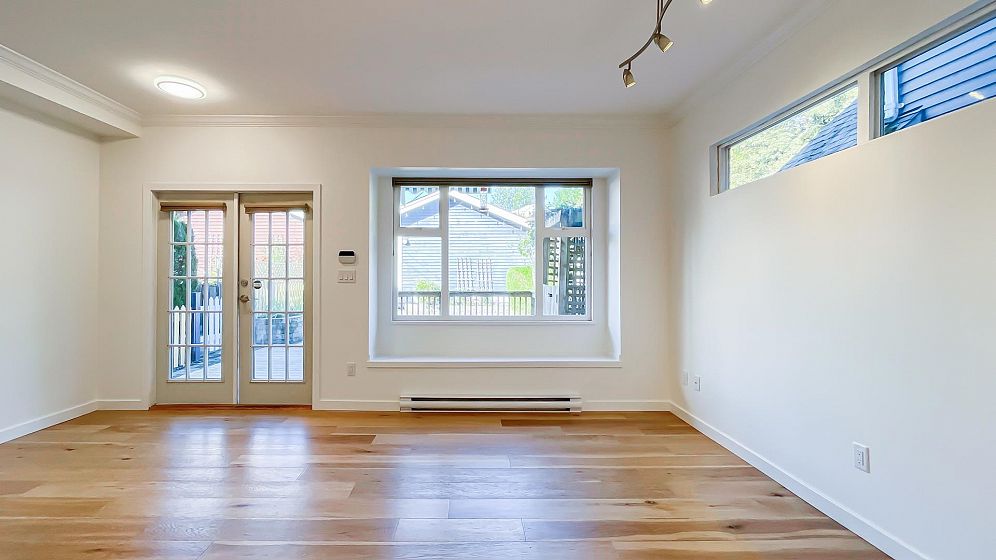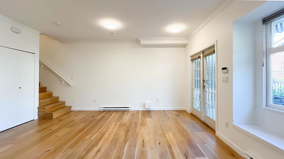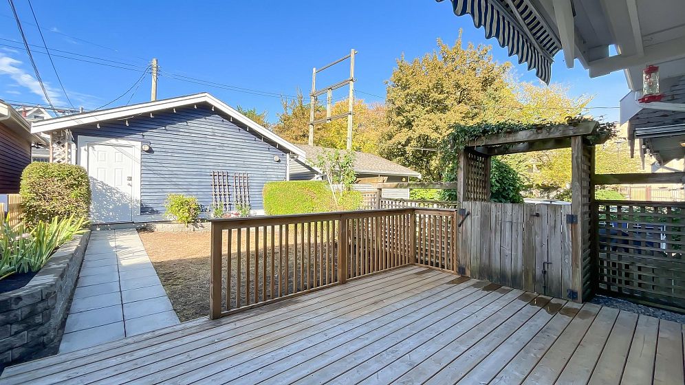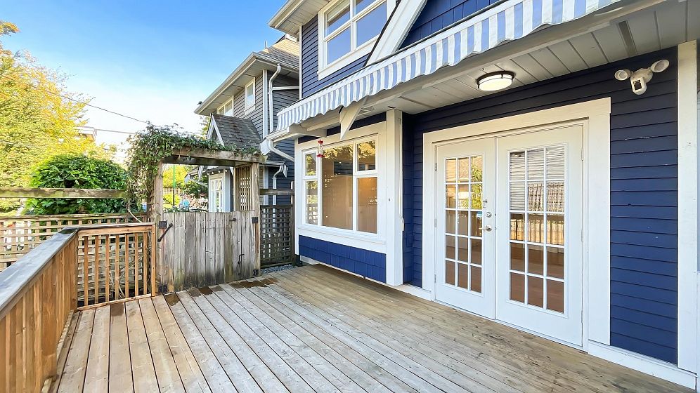 NO STRATA FEES for this 1/2 Duplex on this quiet, peaceful rear facing lot. Beautiful Oak Hardwood floors throughout, featuring french doors through to a private deck and fenced yard with garden. Great for children, pets or entertaining. 2Bed/2bath home with ensuite in master bedroom. Master features a large walk-in closet. The top floor includes a den, or 3rd bedroom, that leads to a gorgeous rooftop deck with stunning mountain views. Recently Remodeled kitchen and tastefully painted throughout. Single car garage with lane access includes lots of storage space. Only 3 blocks from the new St. Paul's hospital. This home is surrounded by parks, schools and local shops and cafes.