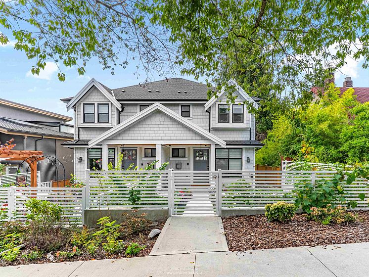 Everything you want from a new single family home but with a better price (and NO GST)! Sitting on a large lot, this half duplex has great outdoor space and a terrific layout for family living. 3 bedrooms, 2 bathrooms upstairs. Living room, dining room, big open kitchen (with 36” Fisher Paykal gas range) and an extra family room area on the main floor. Additional bedroom or office and bathroom downstairs PLUS a legal one bedroom suite with great rental income. This nearly new home features air conditioning, white oak floors with radiant heating, security system, custom tree house, plenty of storage, and is still under warranty. Incredible location close to great schools, shops, restaurants, parks and transit routes on a quiet, cherry blossom lined street. Open Sat/Sun 3-4:30pm.