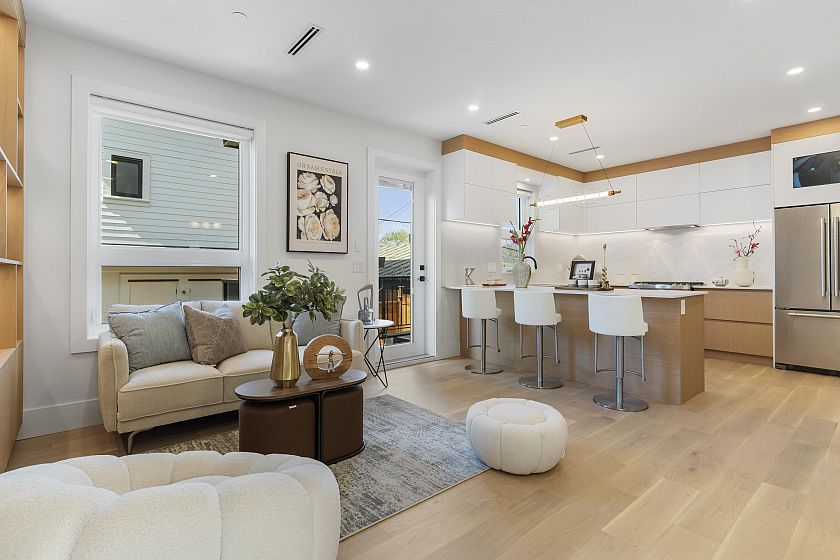 Brand New BACK UNIT 1/2 duplex on a quiet East Vancouver street with lane access! This quality-built home comes with 2-5-10 new home warranty for peace of mind. The main floor features a bright and spacious open layout with living, dining, and kitchen areas – perfect for entertaining. Upstairs offers 3 bedrooms with vaulted ceilings and 2 full bathrooms. The lower level includes a large rec room with full bath and separate entry – ideal for a nanny suite or guests. Includes covered 1-car carport at the back. Convenient location with easy highway access and just minutes to downtown. A must-see home – contact your Realtor today!
