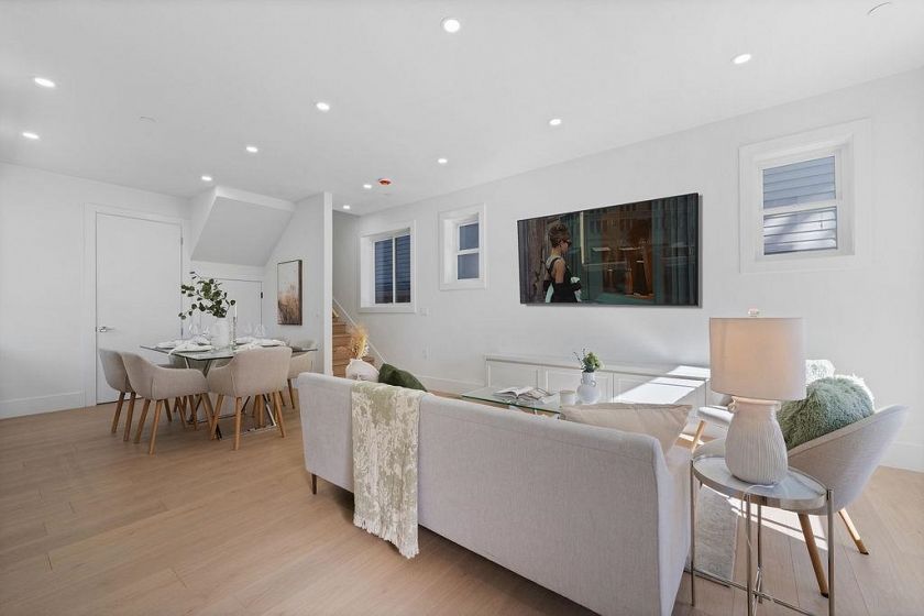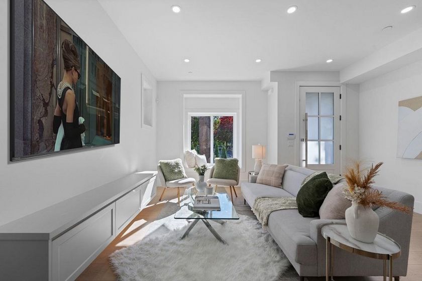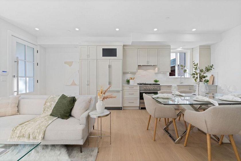 Brand new front half duplex offering over 1,300 sq.ft. of quality living space with 3 bedrooms & 2.5 baths, a fantastic value. From the gated entry & fenced yard to the bright open main floor, every detail impresses. Features include white oak floors, high ceilings, Fisher & Paykel integrated appliances, built-ins, AC & a designer powder room. Two bedrooms & full bath on the 2nd level, top floor primary with ensuite & private balcony, perfect for use as kids room. Sunny southern exposure fills the home with an abundance of light. Bonus single-car garage for secure parking or extra storage. Central location steps to schools, shopping & transit.