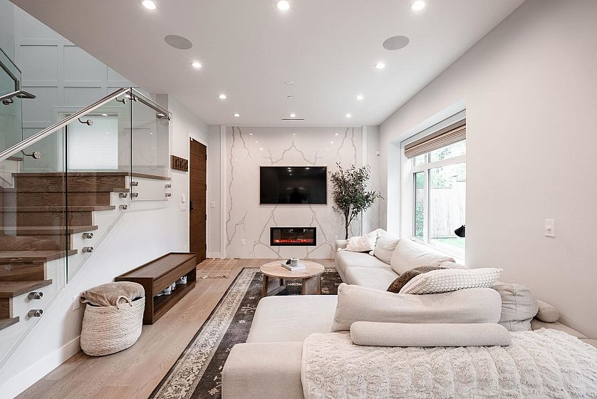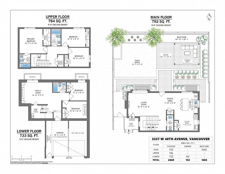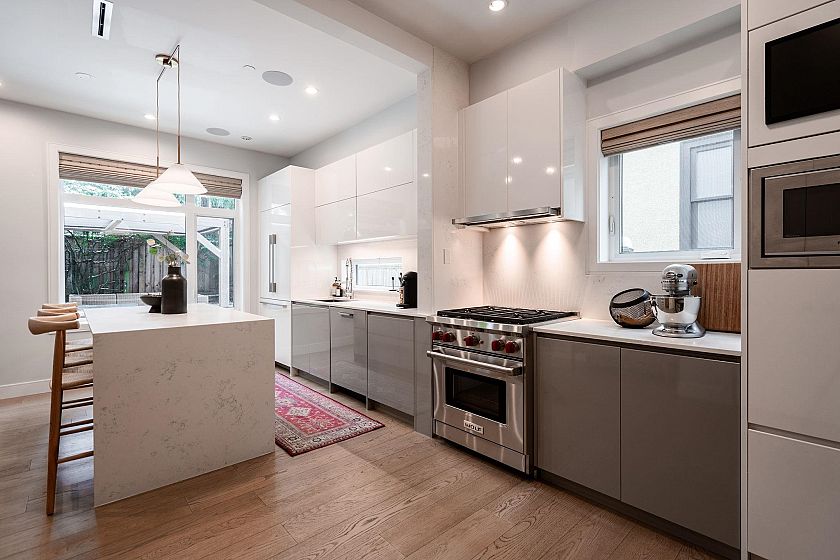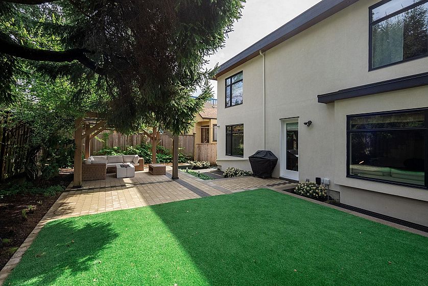 SPECTACULAR, incredibly-rare BACK half-duplex in prestigious DUNBAR w/ almost 2,300 sq ft of beautifully finished living space & over 1700 sq ft of perfectly manicured, sun-drenched, private BACKYARD space. The perfect plan w/ large living & dining, upstairs 3 bed/2bath & downstairs a family room, full bath, 2 beds & plumbed for kitchen (easily converted to suite). Chef's kitchen w/ high end appliances, Wolf gas range & quartz counters. High-end finishes throughout, engineered wood floors, arch. speakers, custom millwork, radiant in-floor heating & AIR-CONDITIONING. Stunning curb appeal & remainder of 2-5-10 warranty. Central location within Kerrisdale Elementary, Point Grey Secondary & Sir Winston Churchill school catchment. Attached garage. OPEN HOUSE SUN NOV 9, 2-4 PM
