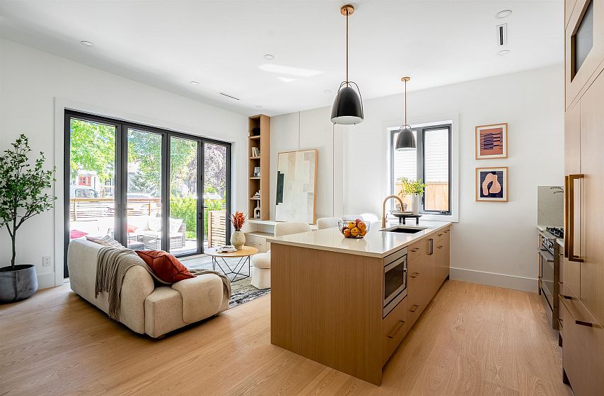 Discover this exceptional, brand-new 3 bed, 3 bath home with a large bonus top floor lounge room, crafted by the multi-award-winning design-build firm, VictorEric. Custom-milled for modern living, it features an airy open-concept layout and a beautifully appointed kitchen with premium integrated appliances. Expansive north-facing windows fill the space with natural light, creating seamless indoor-outdoor living for effortless entertaining. Upstairs, well-proportioned bedrooms offer comfort and privacy, complemented by two elegantly finished bathrooms, including the spa-like ensuite. Enjoy elevated West Side living steps to Main Street, boutique shops, cafes, restaurants, QE Park, Oakridge, and the Canada Line.