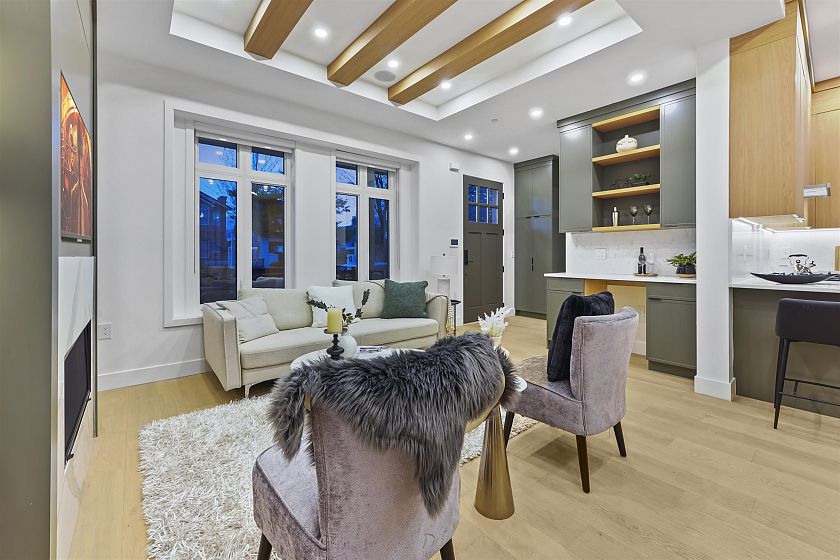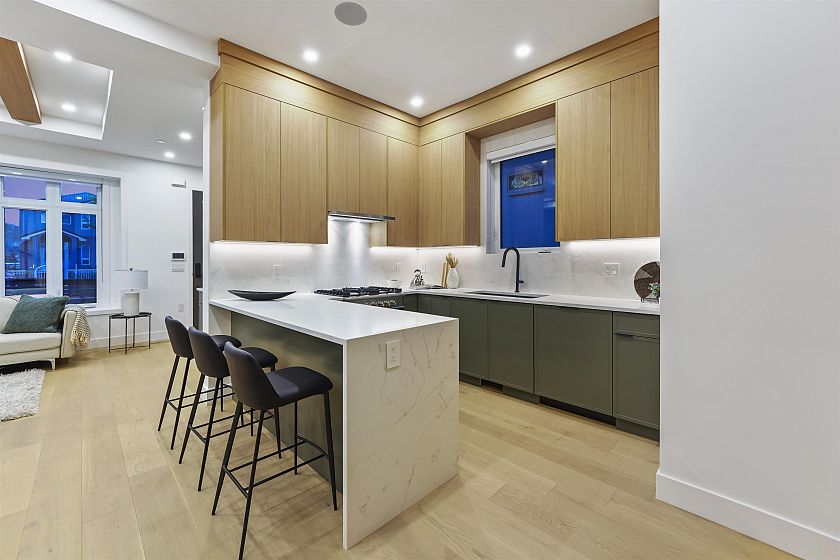 Welcome to this modern front half duplex in the heart of Grandview-Woodland. This 4 bed, 4 bath home offers a functional layout with an open main level featuring 10' ceilings, wide-plank oak floors, built-ins, a gas fireplace, Fisher & Paykel appliances and quartz counters. The second floor includes three spacious bedrooms, one with an ensuite and walk-in closet. The top level offers another bedroom, full bath and a covered private balcony with mountain views. Additional features include A/C, security cameras, Kohler & Riobel fixtures, 600+ sq ft of crawl-space storage, a fenced yard and single garage. Book your private showing today!