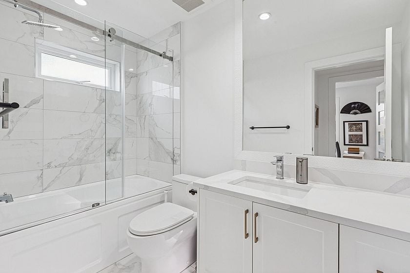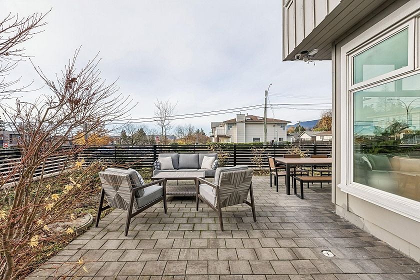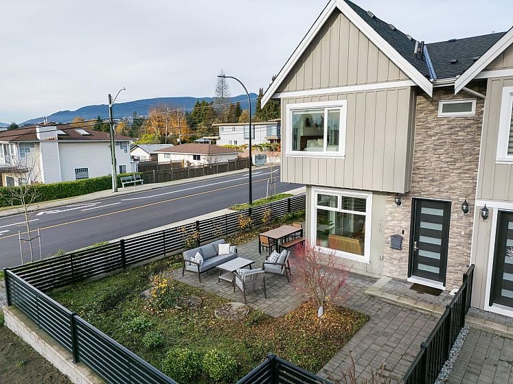 Thoughtfully designed for both functionality and aesthetics, this beautiful duplex offers modern comfort and style. With over-height ceilings and hardwood floors throughout, this quality-built home boasts over 2000 sqft of living space. Inside, enjoy a bright & inviting living/dining area with french doors that lead you out to a spacious 600 sqft patio & fenced yard. The well-appointed gourmet kitchen with gorgeous cabinetry & sleek stainless steel appliances is the heart of this home. Downstairs - a theatre room with wet bar and a full bathroom. Upstairs - 3 bedrooms each with a view of Stanley Park as well as two bathrooms offering contemporary finishings & fixtures. For added enjoyment, take in the views of the city & North Shore Mtns from the private rooftop deck. Call today!