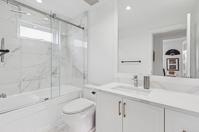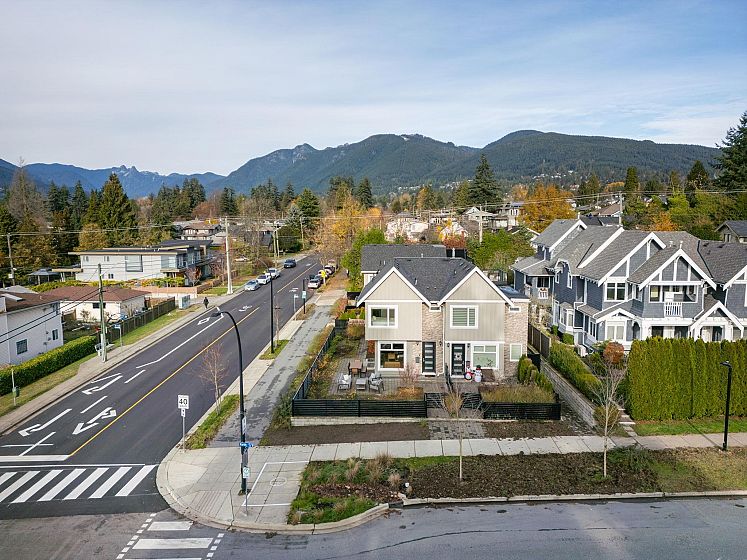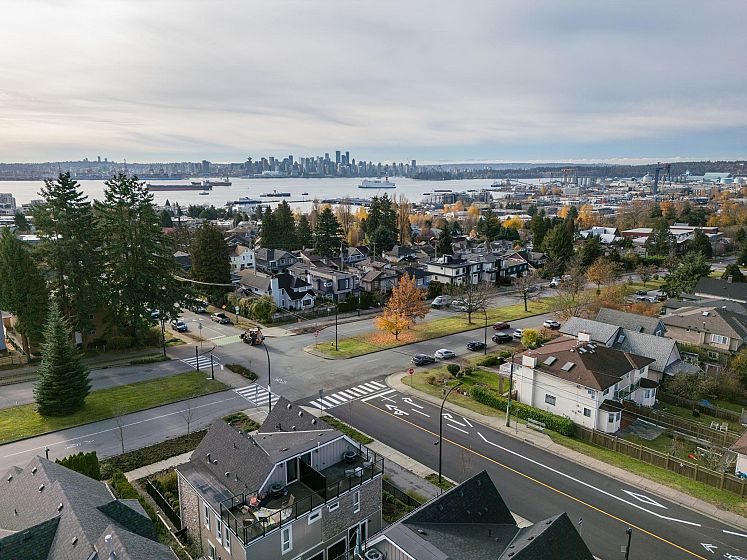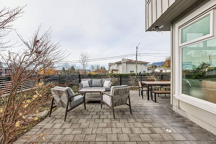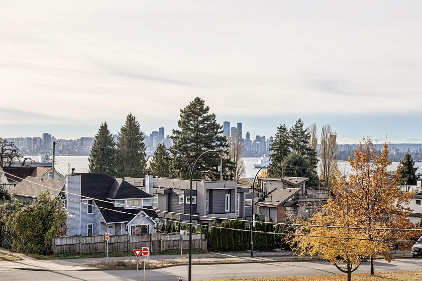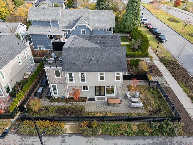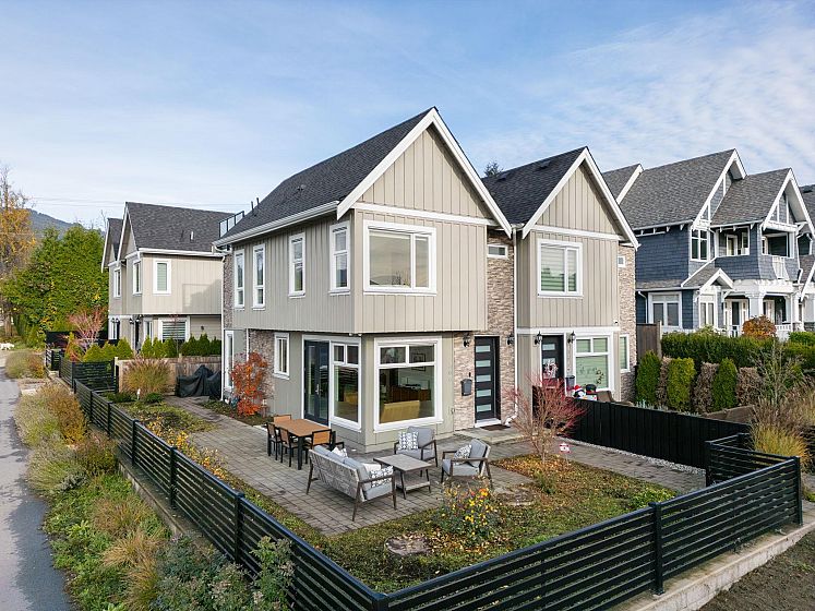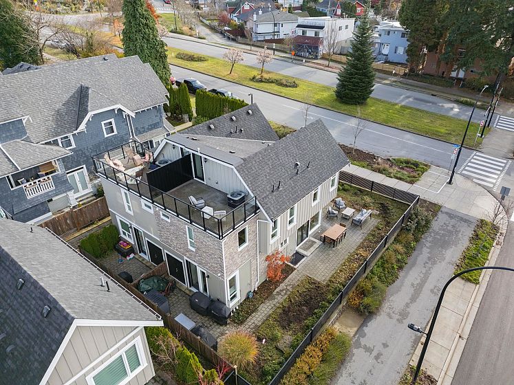 Thoughtfully designed for both functionality and aesthetics, this beautiful duplex offers modern comfort and style. With over-height ceilings and hardwood floors throughout, this quality-built home boasts over 2000 sqft of living space. Inside, enjoy a bright & inviting living/dining area with french doors that lead you out to a spacious 600 sqft patio & fenced yard. The well-appointed gourmet kitchen with gorgeous cabinetry & sleek stainless steel appliances is the heart of this home. Downstairs - a theatre room with wet bar and a full bathroom. Upstairs - 3 bedrooms each with a view of Stanley Park as well as two bathrooms offering contemporary finishings & fixtures. For added enjoyment, take in the views of the Burrard Inlet & North Shore Mtns from the private rooftop deck.
