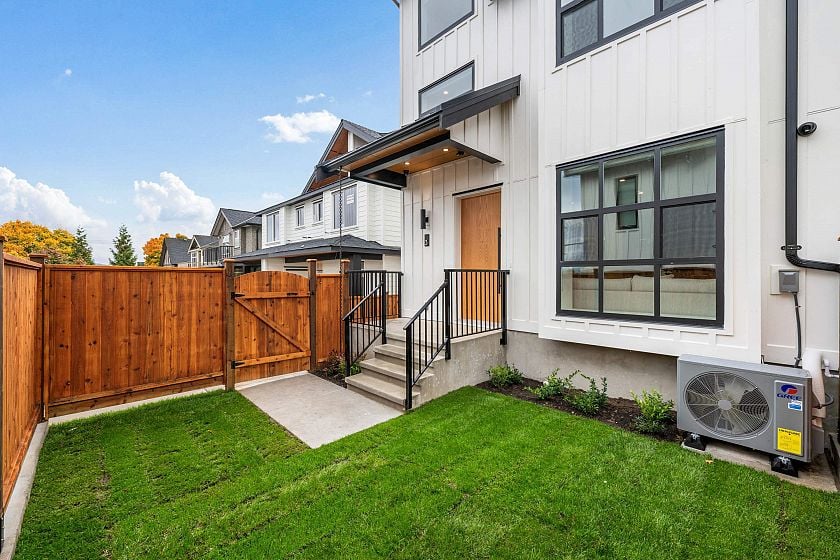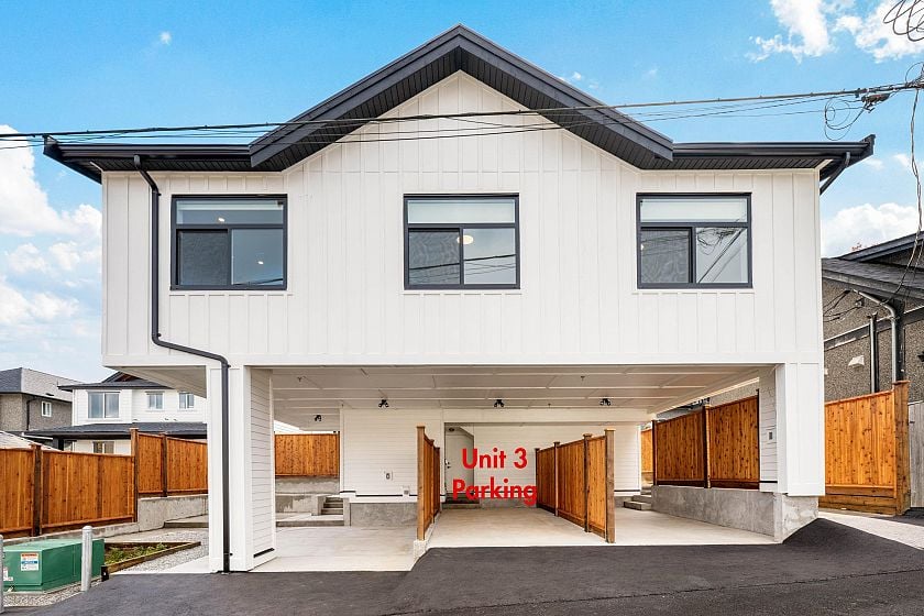 BRAND NEW 3-level BACK UNIT in a quality-built multiplex by an experienced builder, ideally located on a WIDE street in Renfrew East Vancouver With lane access, and a covered 1-CAR COVERED CARPORT. Thoughtfully designed with high-end finishes and backed by a 2-5-10 home warranty. Main floor offers a bright living room with custom cabinetry, dining area, 2-tone kitchen with s/s appliances, and a FULL BATH . Second level has 2 spacious bedrooms + full bathroom. Top level features the primary bedroom with walk-in closet, ensuite, and 2 large BALCONIES for outdoor living. Features include A/C, security cameras, quartz counters, and designer tile in all baths. Great access to downtown and major routes. Close to T&T Supermarket & PNE. Call your Realtor today!