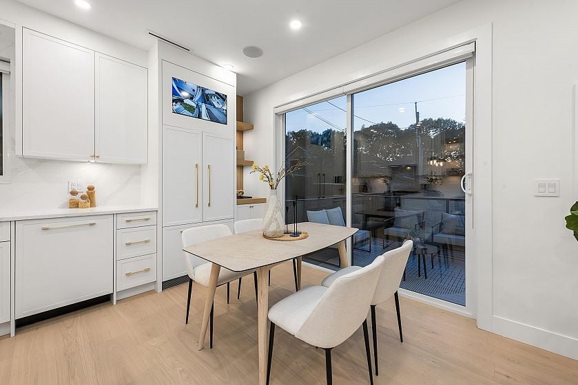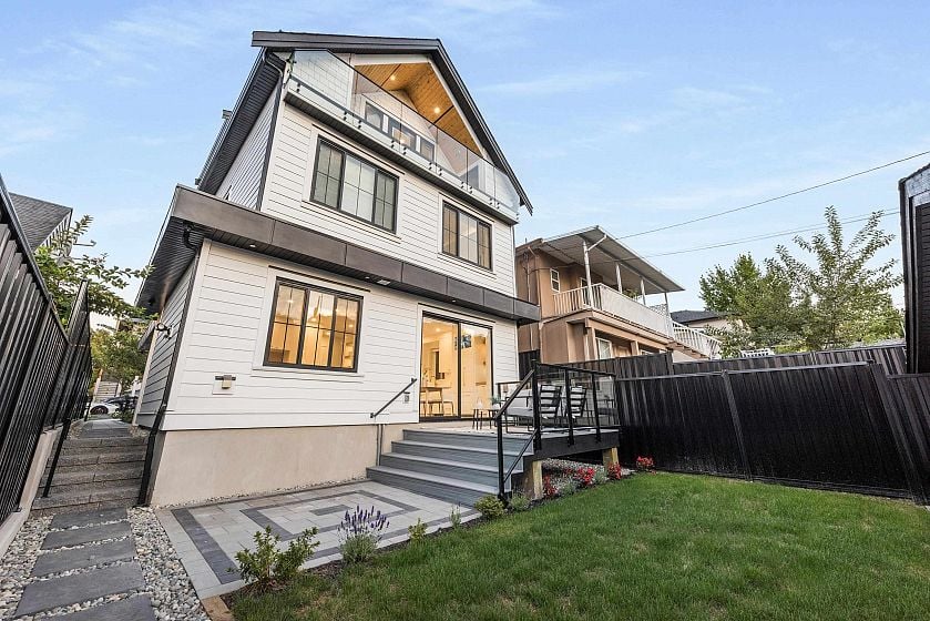 This brand new BACK half duplex is thoughtfully crafted by an experienced builder who carefully selected premium materials throughout, from custom closets to built-in cabinetry. The main floor boasts 10 ft ceilings, a spacious open layout, Fisher & Paykel appliances, quartz countertops, a custom bar/pantry, and a built-in entertainment centre. Enjoy both an elevated deck and ground floor patio, perfect for indoor-outdoor living. Modern comforts include a heat pump, forced air, air conditioning, alarm/security system with monitors, electric fireplace, and in-ceiling speakers. The home offers a stunning top-floor balcony view, single-car garage with roller-style doors, and a covered entryway. Conveniently located near Victoria Drive shops, Mount Pleasant, Downtown Vancouver & bus to UBC