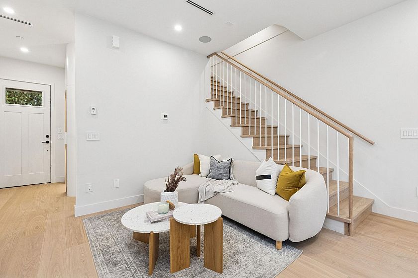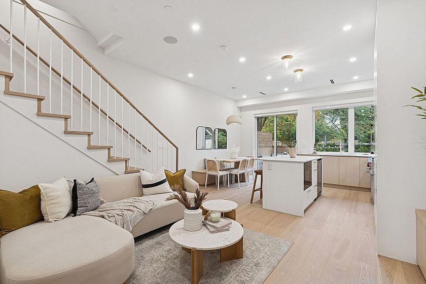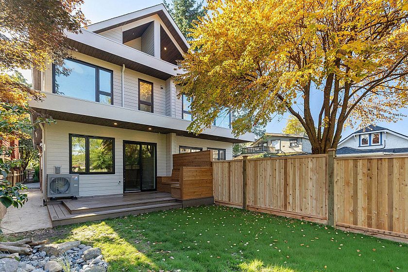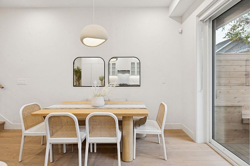 This newly built side-by-side duplex blends timeless design w/luxurious sophistication. With 4-beds/3.5 baths, the home flows effortlessly across 3 levels, ensuring no wasted space. The main floor feats a sleek Miele kitchen, anchoring the open living & dining areas, complete w/built-in bench seating & hidden storage. Sliding doors extend to a private backyard oasis w/built-in seating, perfect for entertaining. Upstairs are 3-beds & 2 full baths, incl. the spacious primary suite w/spa-inspired ensuite. Top floor is the ultimate retreat w/north & south patios, full bath, & flexible bdrm that can serve as an office, gym or media room. High-end finishes, custom millwork, heat pump +AC, 550 sqft crawl space, attached garage & an unbeatable location near Main Street complete this stunning home.