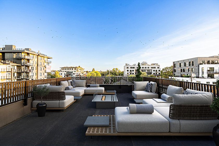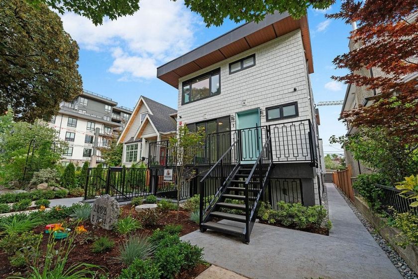 3-Level Home with 400sqft Rooftop Deck! Stunning 3 beds, 3 baths residence on iconic E. 8th Ave, just steps from Commercial Dr. Thoughtfully designed by Architrix with interiors by ETHEREAL DOMUS, this spacious home boasts engineered oak floors, custom fluted millwork, built-in closets, and a cozy fireplace. The gourmet kitchen impresses with Fisher & Paykel appliances, quartz counters, stone accents, and a waterfall island. Enjoy seamless indoor-outdoor living with oversized black sliding doors opening to a tiled balcony,and professional landscaping. Includes A/C with heat pump, EV-ready storage shed, walk-in pantry/den, and loads of natural light. Relax or entertain on the massive rooftop deck. Steps to SkyTrain, buses, Trout Lake, shops & dining. Includes 1 parking, bike room & storage