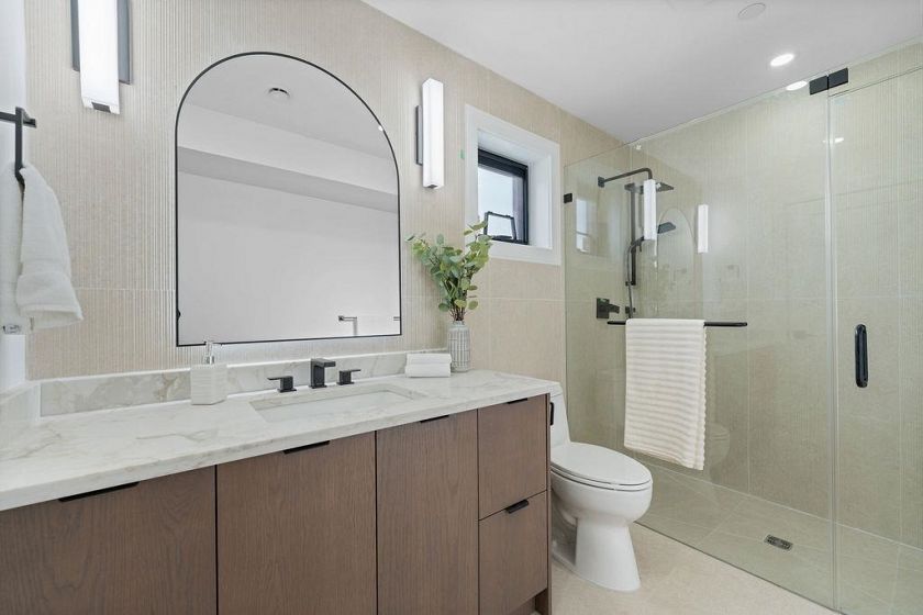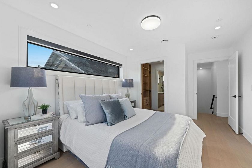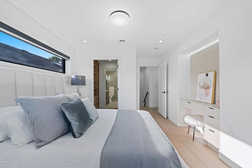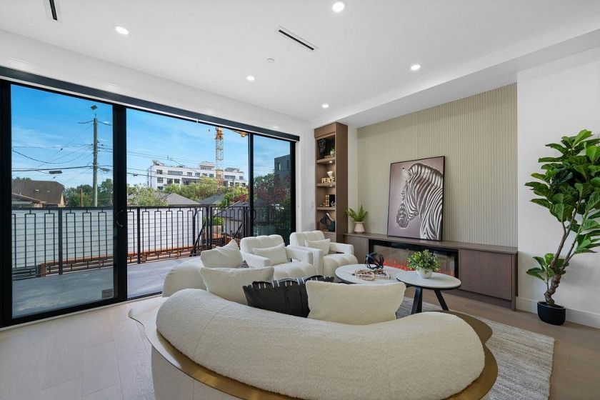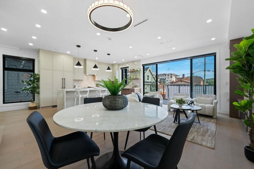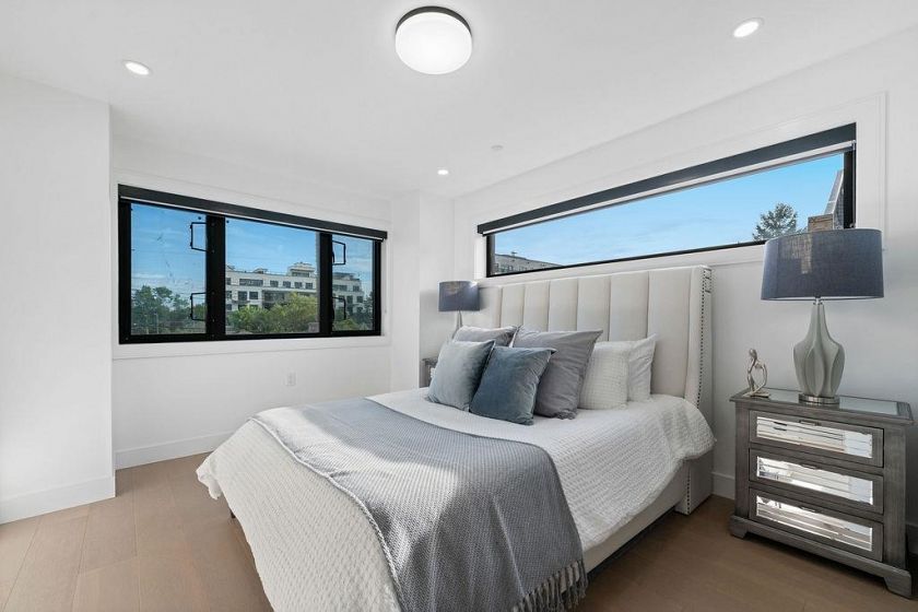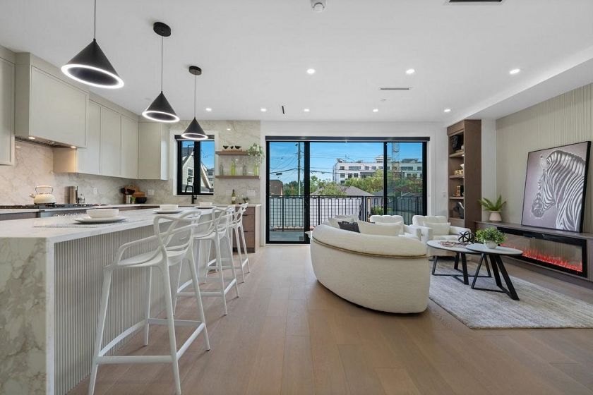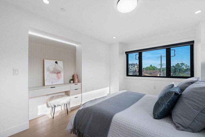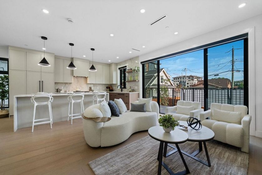 RARE 2-LEVEL BACK UNIT ! Stunning 3 beds, 3 baths south-facing home on iconic E. 8th Ave, steps from Commercial Dr. Designed by Architrix with interiors by ETHEREAL DOMUS, this spacious unit features engineered oak floors, custom fluted millwork, built-in closets, and a cozy fireplace. Gourmet kitchen with Fisher & Paykel appliances, quartz countertops, stone accents, waterfall island. Enjoy large black sliding doors, EV-ready storage shed, A/C heat pump, oversized tiled balcony, Paver stone patio, pro landscaping, and walk-in pantry/den. Near SkyTrain, bus routes, Trout Lake & shops. Loads of Natural Light.Includes 1 parking, bike room, storage