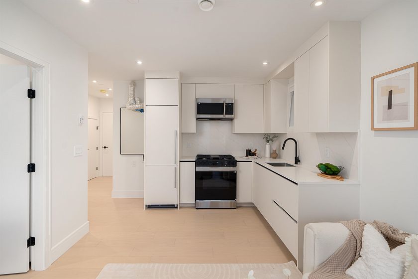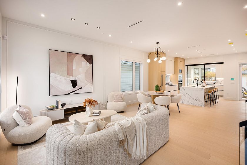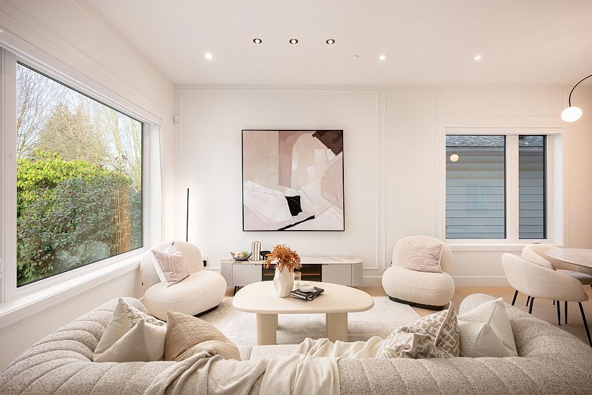 BRAND NEW EXQUISITE SIDE-BY-SIDE DUPLEX by acclaimed builder VANTAC, where exceptional craftsmanship meets refined family living. This stunning home showcases soaring ceilings, elegant transitional accents, and open-concept layout designed for modern lifestyles. The open kitchen impresses with a striking waterfall island, German-engineered Miele integrated appliances, and a fully equipped wok kitchen, perfect for hosting & entertaining. Triple-glazed windows deliver superior comfort and tranquility. The luxurious primary suite features a custom matte black glass closet, spa-inspired ensuite w/ double floating vanity. Upper level offers 3 beds 2 baths, plus a LEGAL basement suite providing flexibility as a mortgage helper, guest suite, or entertainment space. Single garage with EV charging.