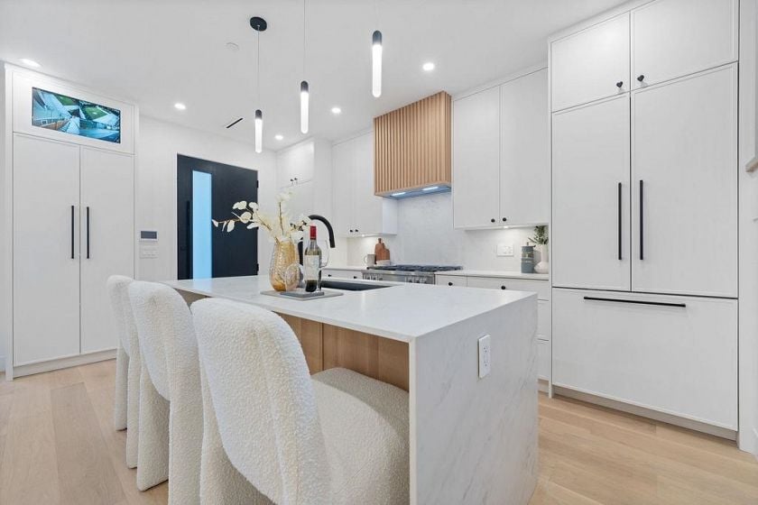 Built by renowned Westside builder Mann Bros Construction, this brand-new front 1/2 duplex in the heart of Kitsilano is a masterpiece of design and craftsmanship, with no detail spared. This 3 bed, 4 bath home blends timeless style with modern comfort. The main floor boasts an expansive, open-concept layout with a sleek Miele kitchen, Dekton counters, custom cabinetry, and a 7-ft island. High ceilings, triple-glazed windows, radiant in-floor heat, and eclipse doors create seamless indoor-outdoor living. Features include A/C, built-in speakers, EV-ready garage, and smart home features. Spa-inspired bathrooms feature Riobel and Kohler fixtures, frameless glass showers, and smart toilets. Enjoy mountain views in one of Vancouver’s most walkable and family-friendly neighbourhoods.